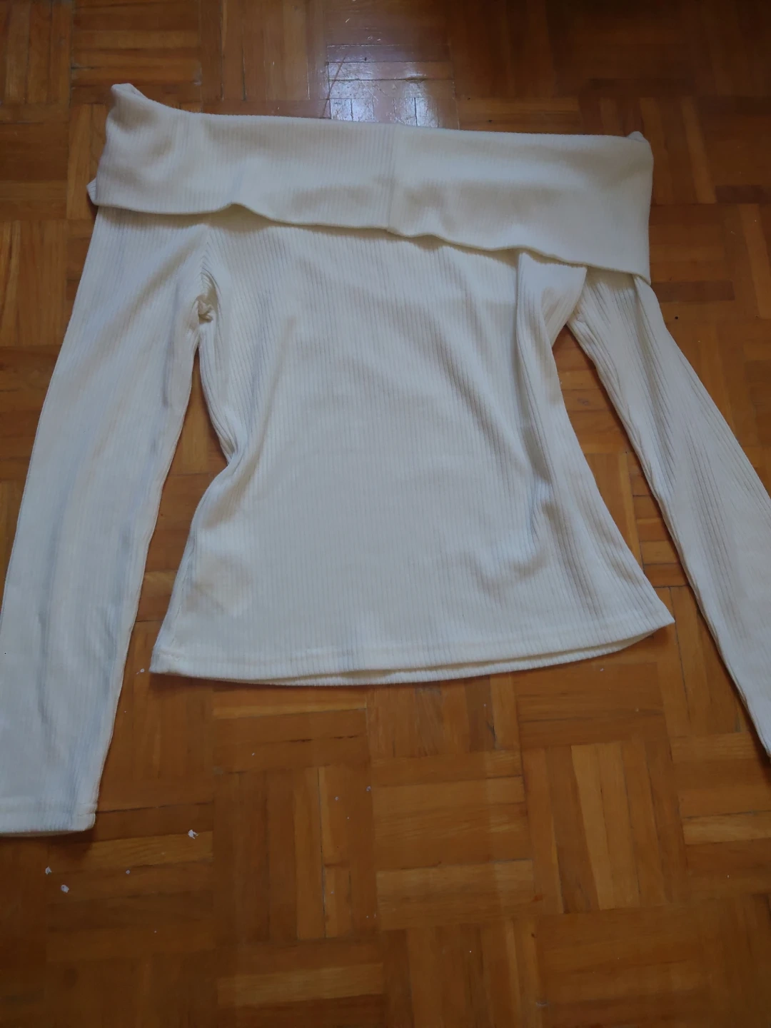 Selling a cream-coloured, off-the-shoulder long sleeve top. It's in great condition and perfect for layering or wearing on its own