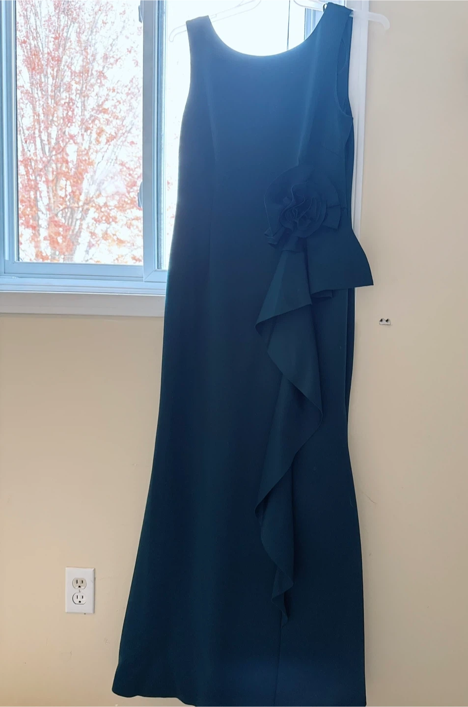 This is a lovely black sleeveless dress in great condition! It features a unique floral detail and cascading ruffle design. Perfect for a special occasion or a night out