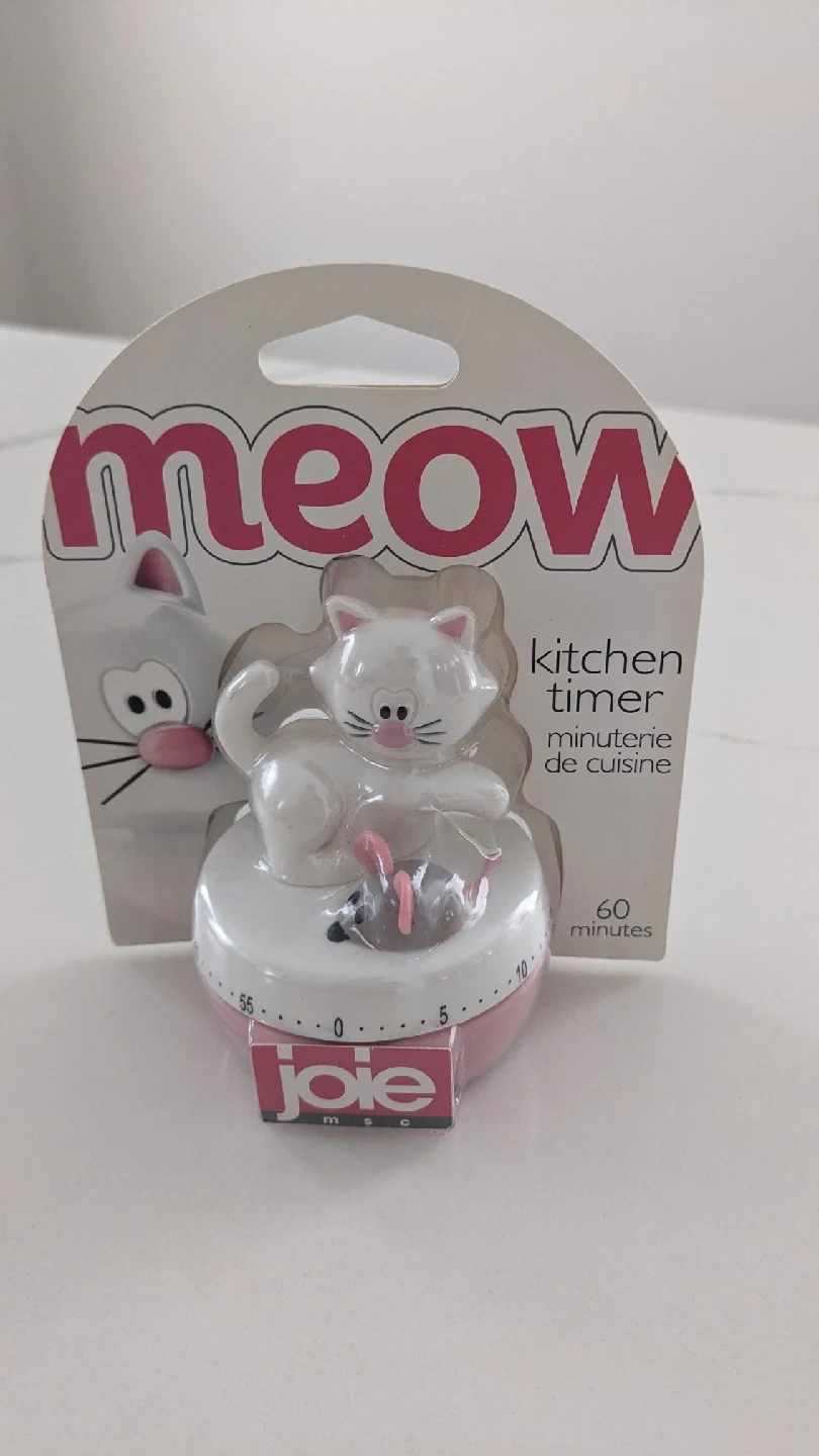 Cute Joie Meow 60-minute kitchen timer! It's perfect for timing your baking or cooking needs. The timer counts down from 60 minutes, and the design features an adorable cat.