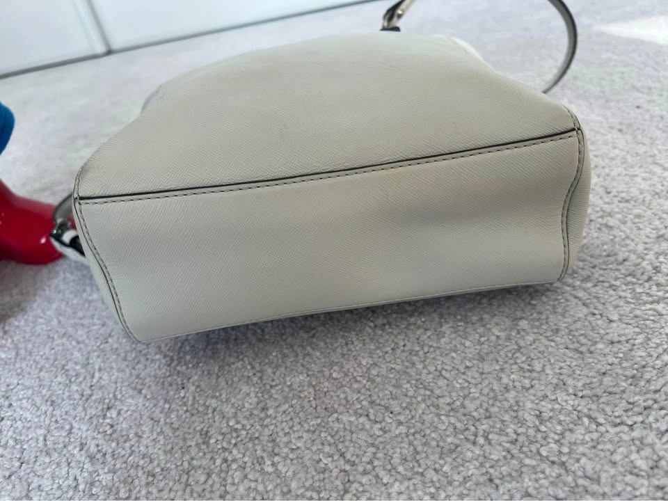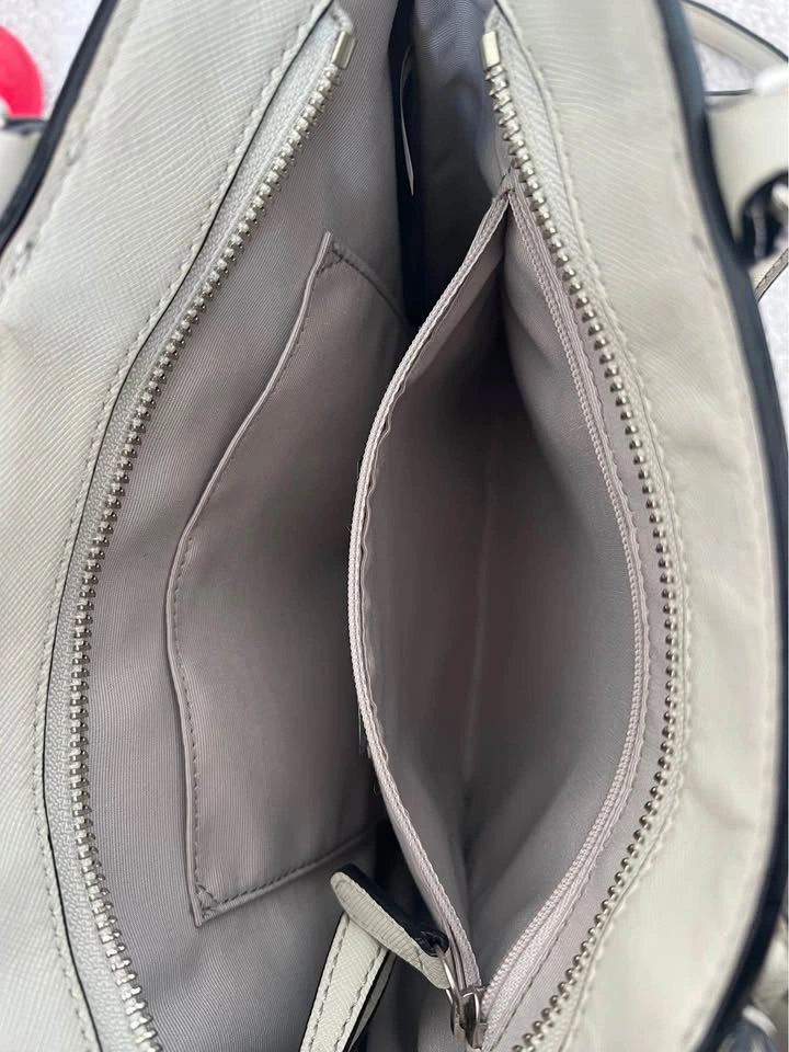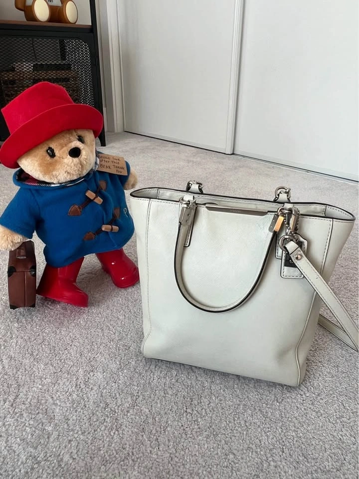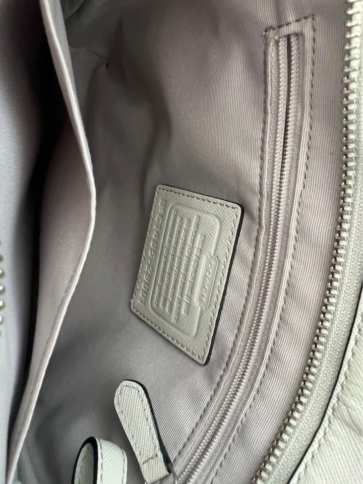 Elegant genuine leather COACH bag in warm white. Classic and versatile design with durable saffiano-textured leather. Can be carried by hand or worn on the shoulder; fits daily essentials comfortably.