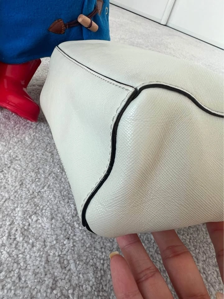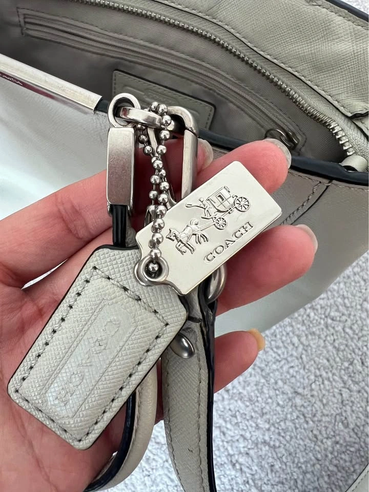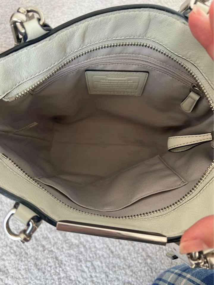 Elegant genuine leather COACH bag in warm white. Classic and versatile design with durable saffiano-textured leather. Can be carried by hand or worn on the shoulder; fits daily essentials comfortably.