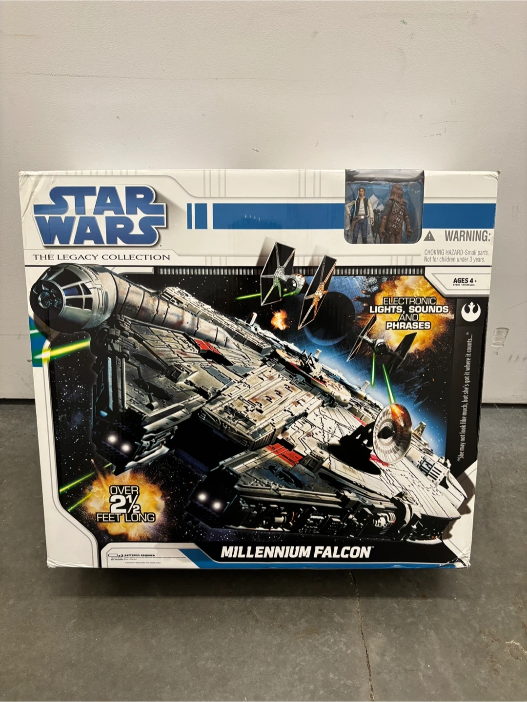 Selling a Star Wars Legacy Collection Millennium Falcon. The box includes electronic lights, sounds, and phrases. It's over 2 1/2 feet long! This is the fastest ship in the galaxy, ready for endless action and adventure. It features boarding ramps with auto-opening hatches and a removable canopy that makes the cockpit accessible