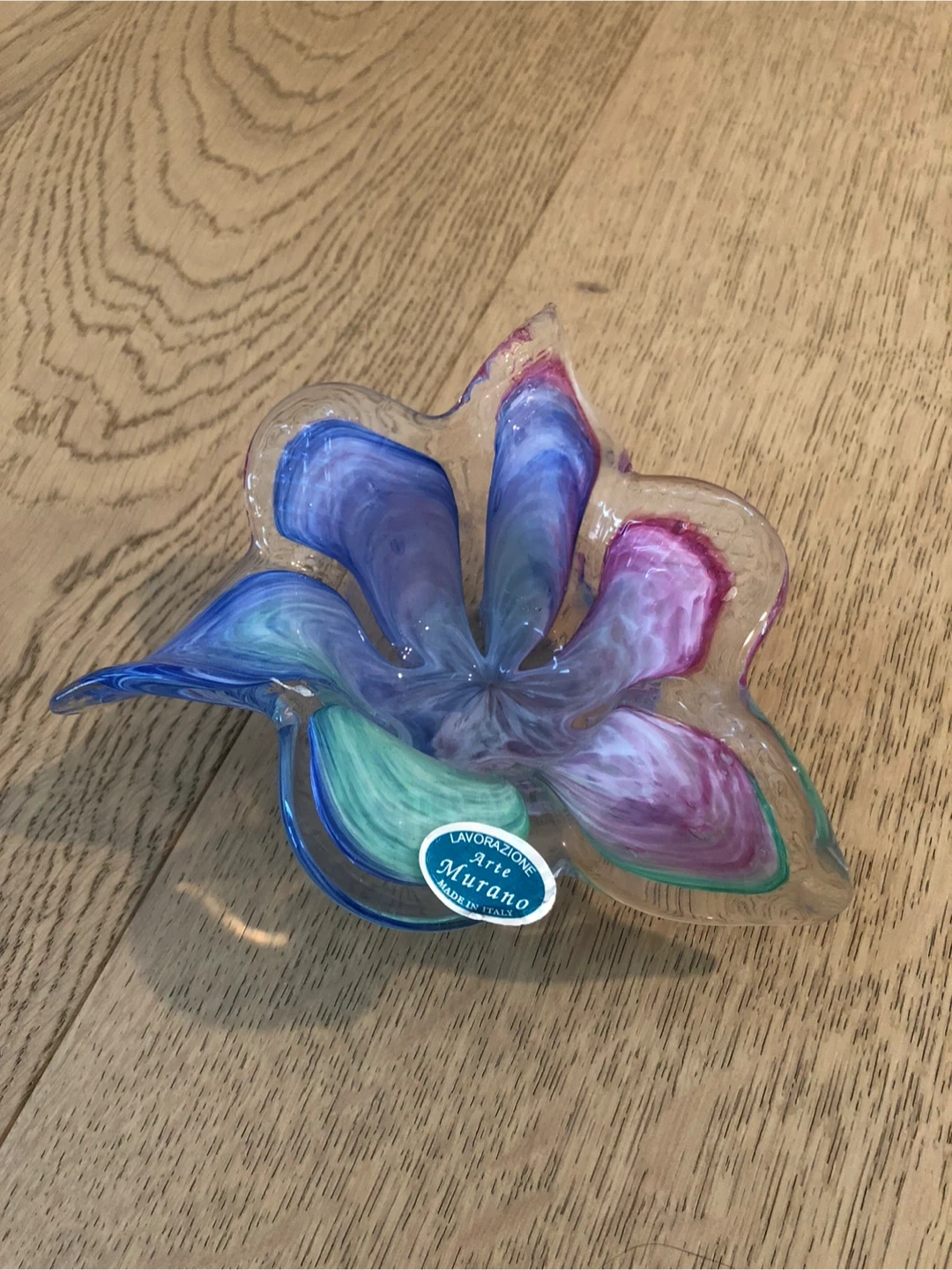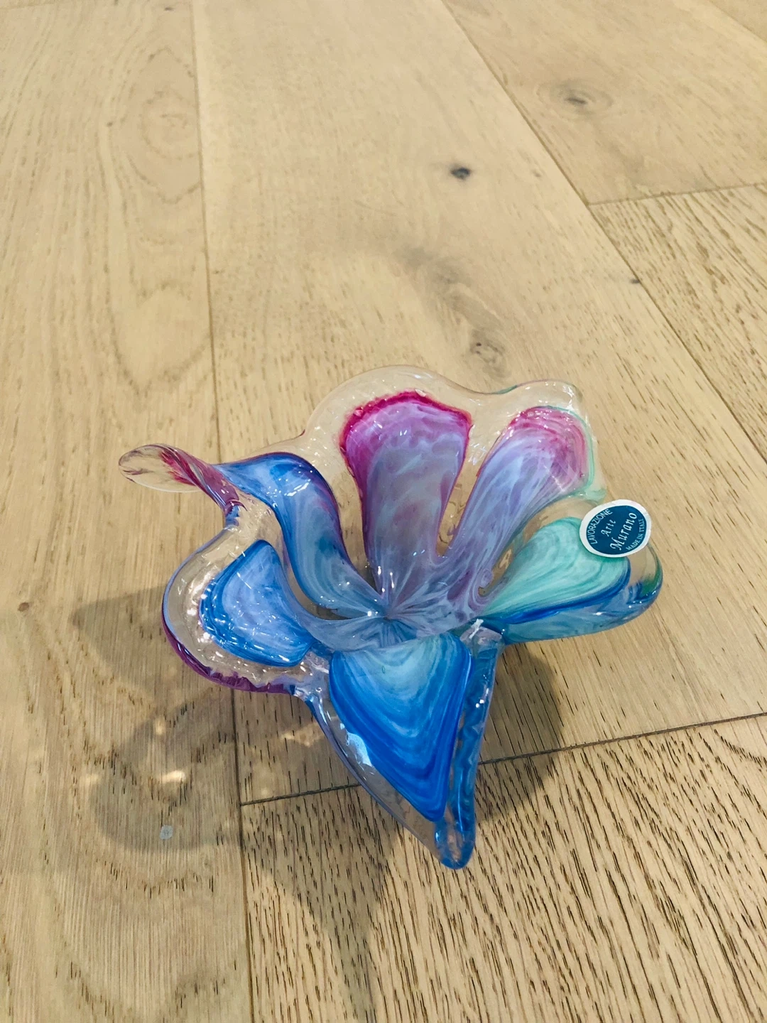 This is a beautiful Lavorazione Arte Murano glass bowl. It features a lovely flower design with blue, pink, and green hues. It would make a great addition to any home! Around 15cm diameter.