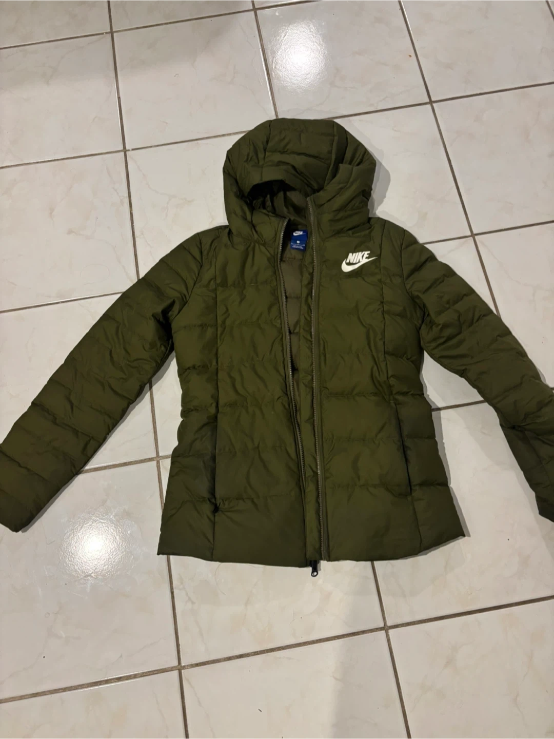 Selling a Nike puffer jacket in olive green. It's a size small and in great condition! Perfect for staying warm this winter.