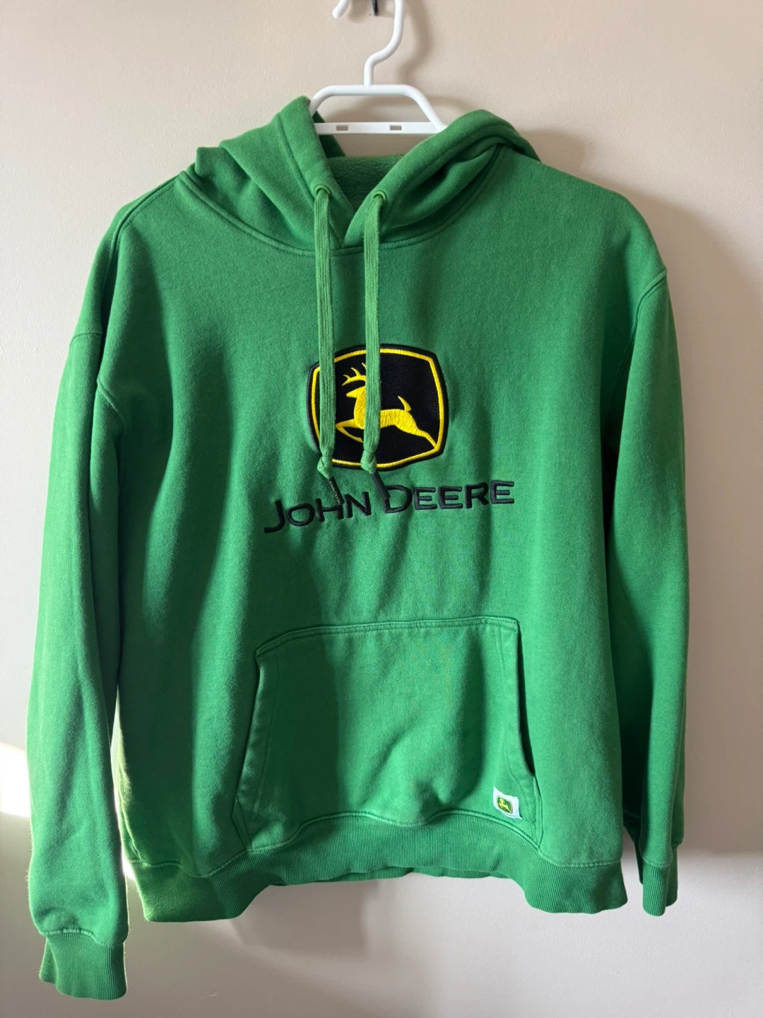 Selling a John Deere hoodie in a vibrant green! It's a size large and features the classic John Deere logo. Perfect for staying cozy while showing off your love for the brand.
