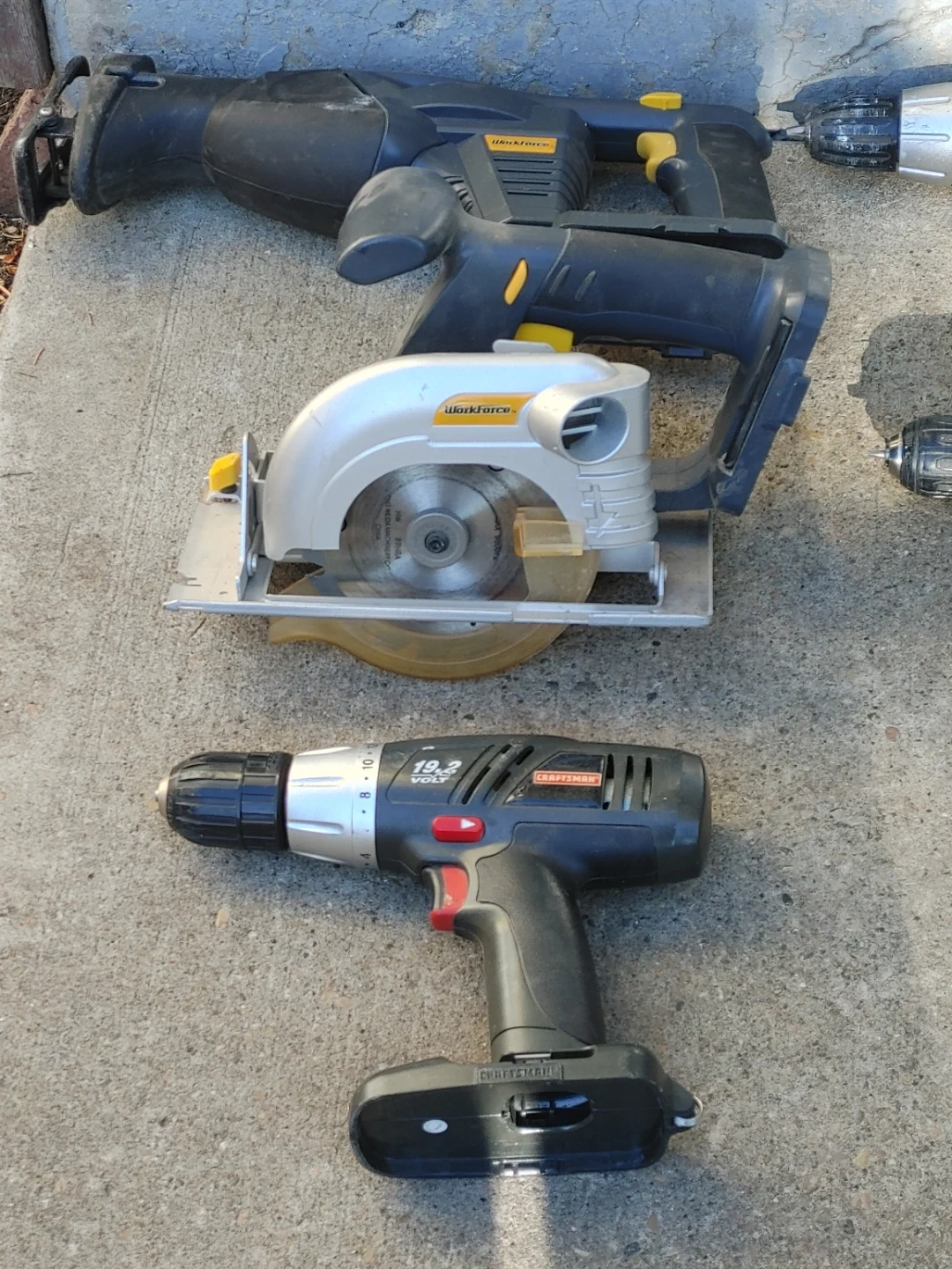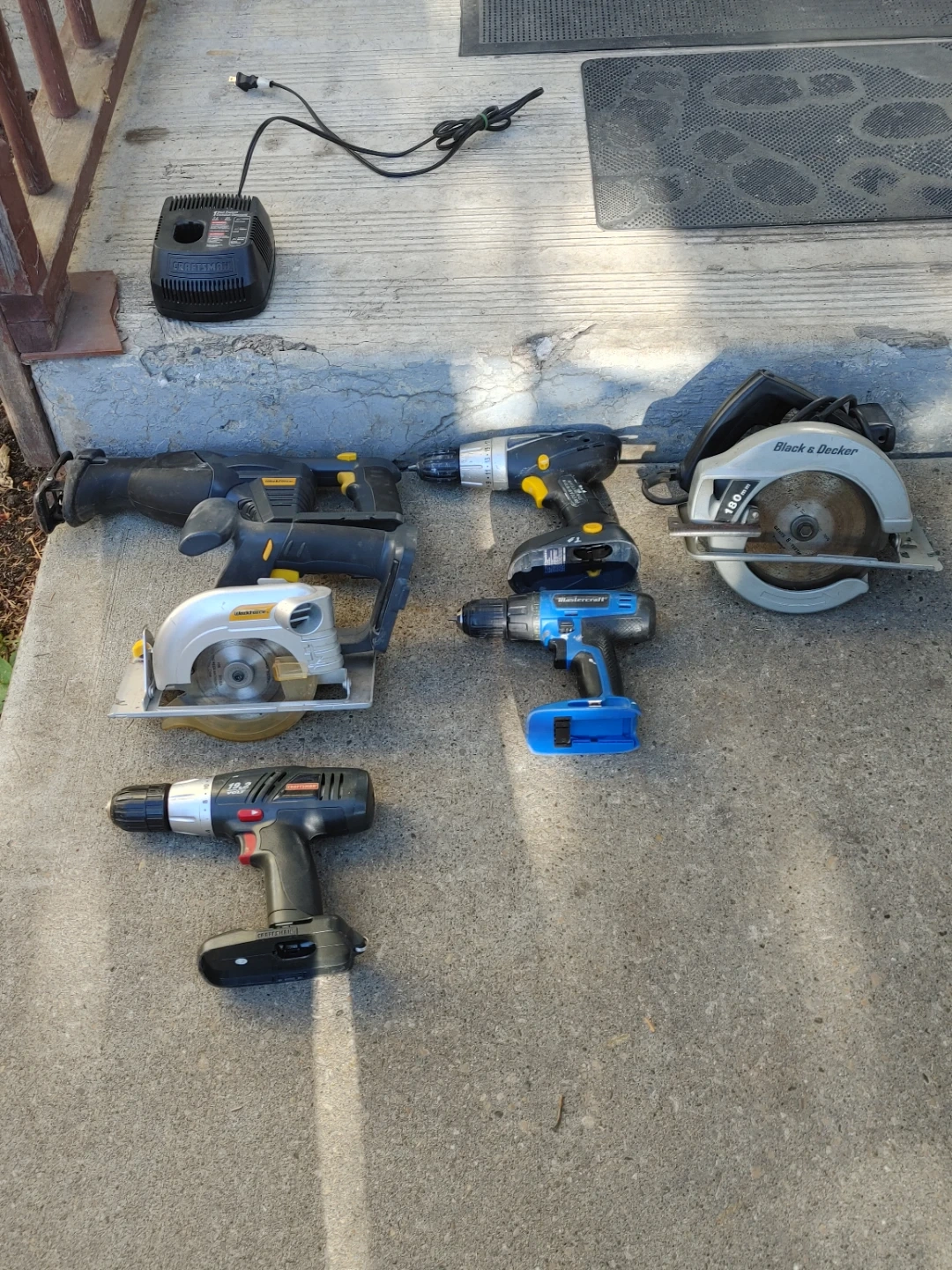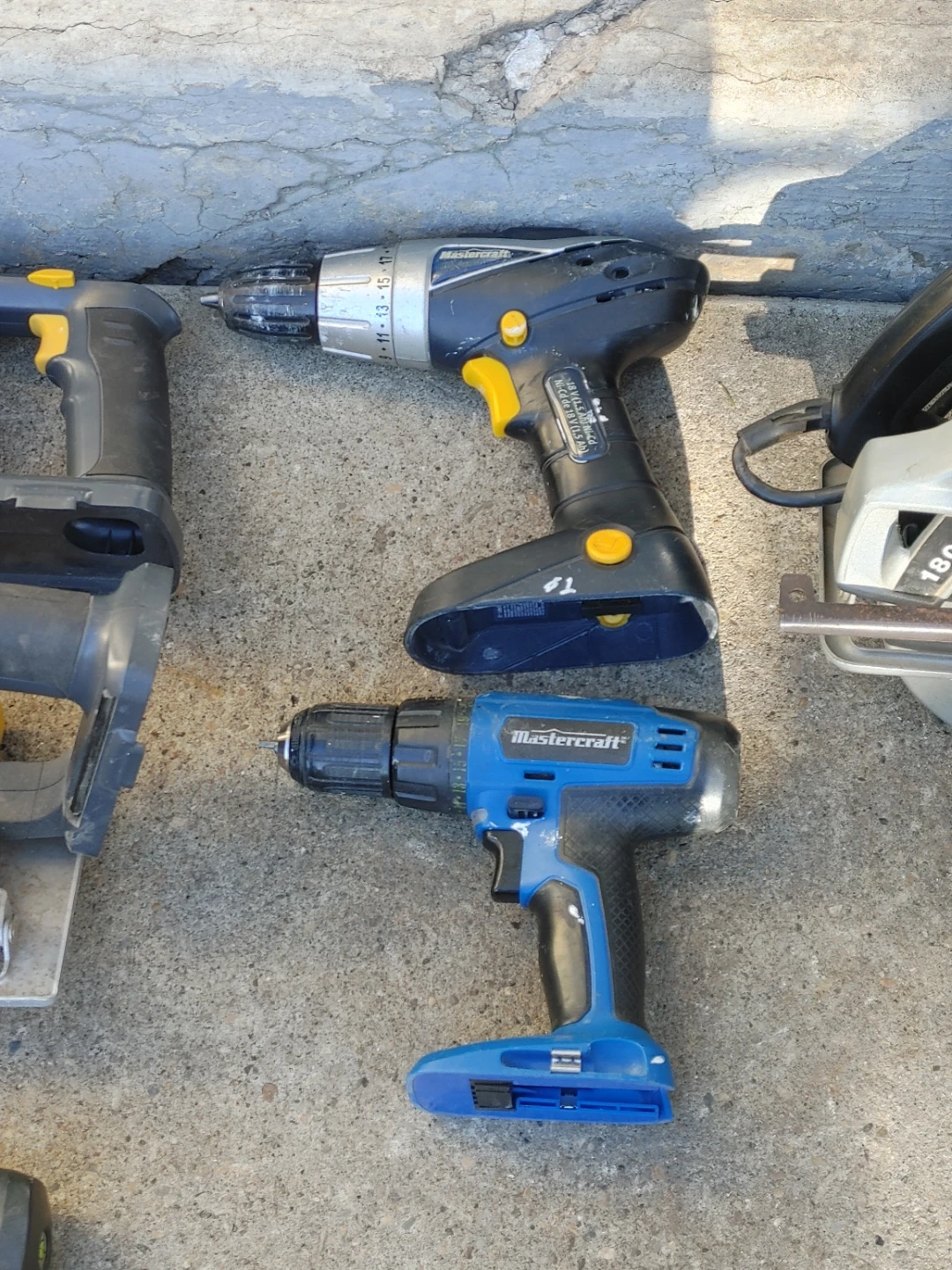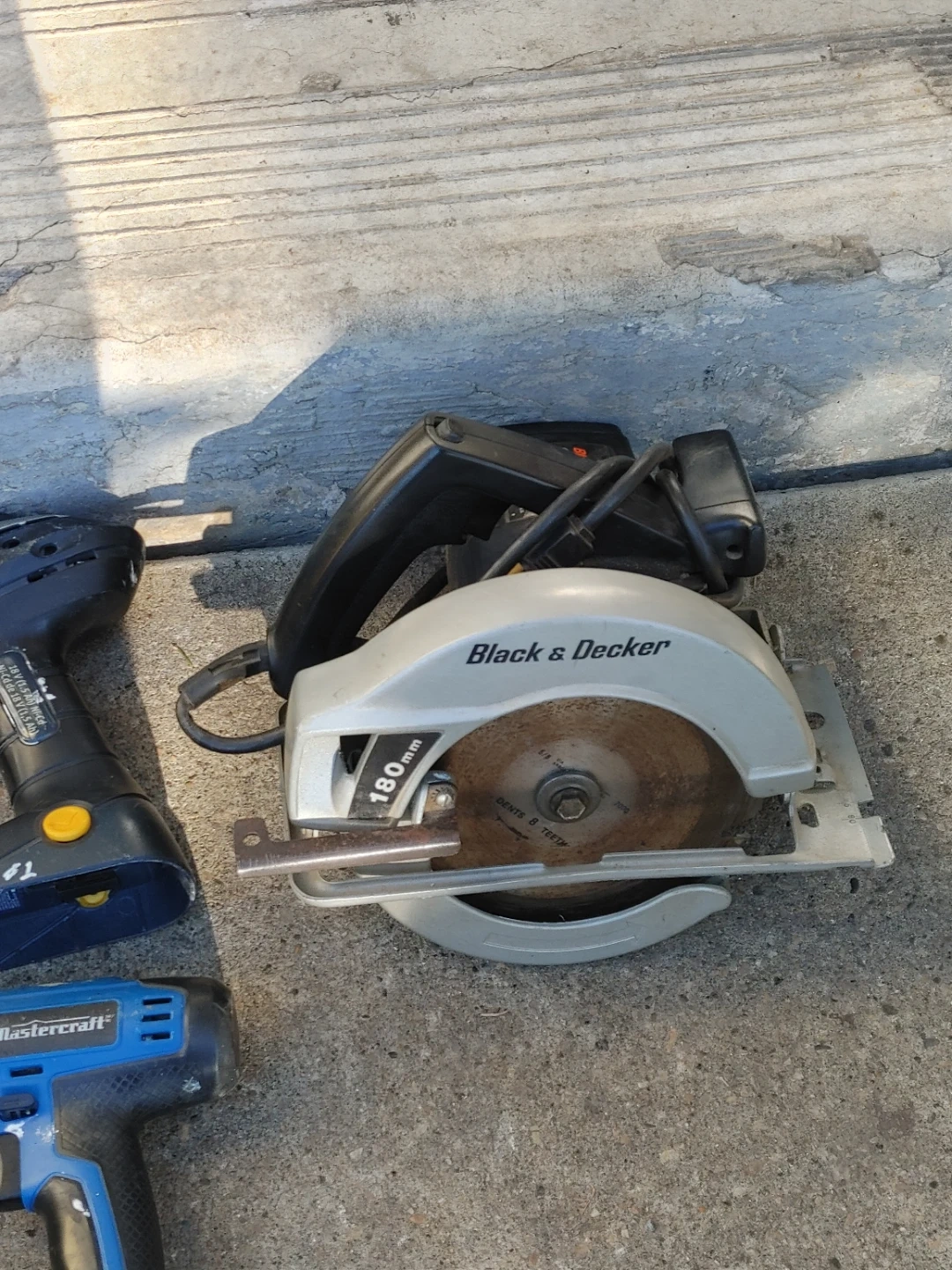 67Give me an offer I want them all gone Selling a variety of power tools including Mastercraft and Black & Decker drills and a circular saw. They're used but still have some life left in them! Chargers are included.