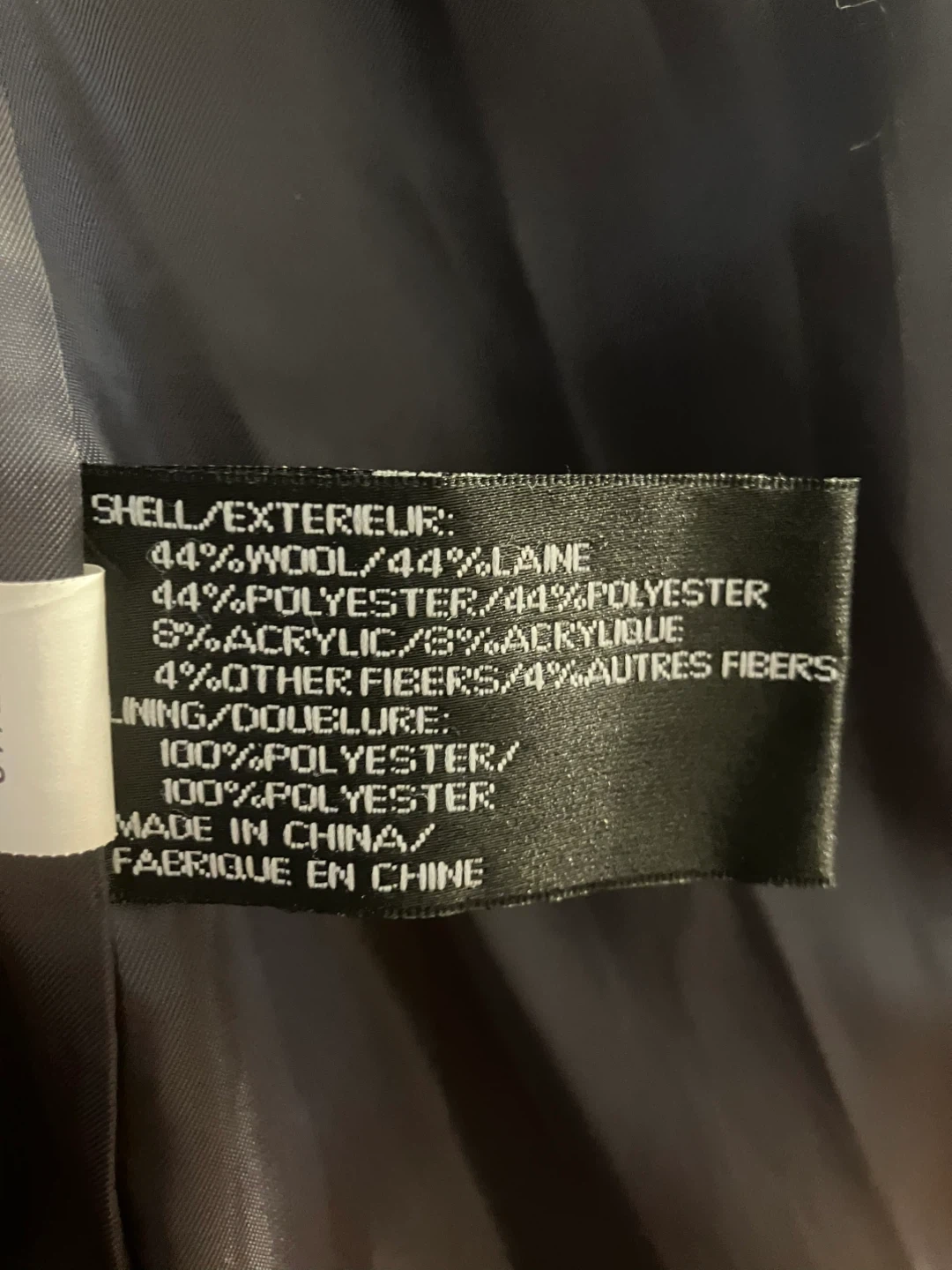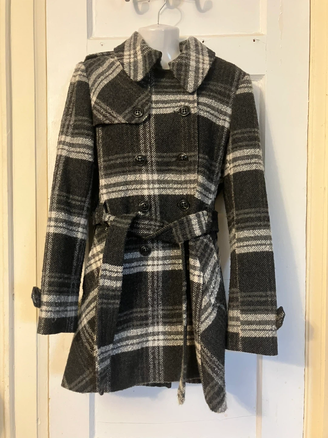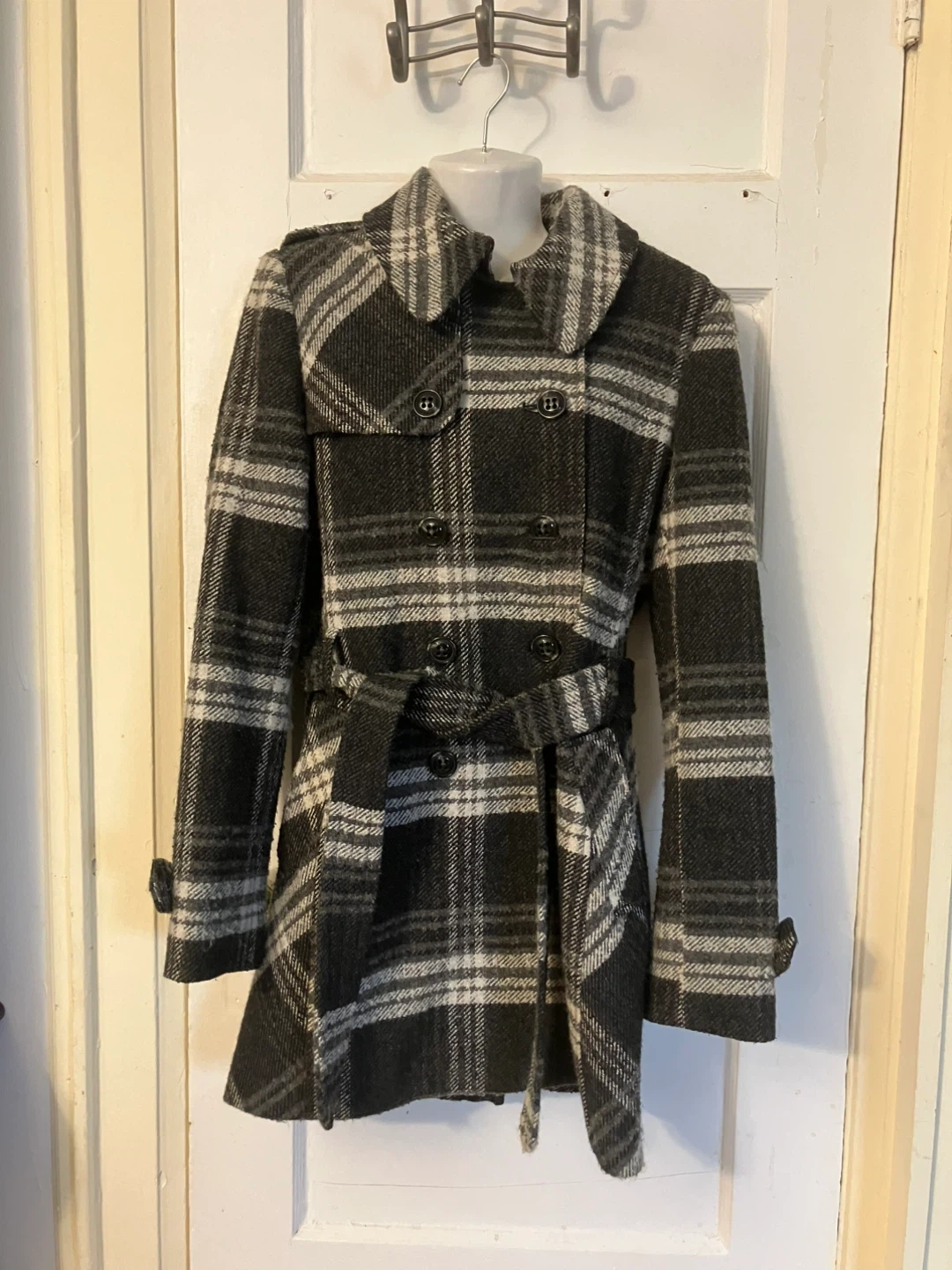 Here's a DKNY coat in a classic plaid pattern! It's a size small and made with a blend of wool, polyester, and acrylic. The shell is 44% wool, 44% polyester, 8% acrylic, and 4% other fibers. The lining is 100% polyester.
