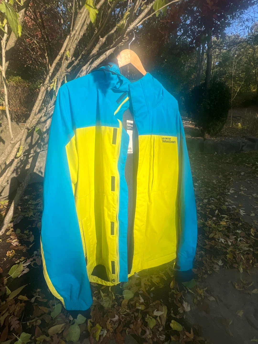 Selling WestBeach snowboarding jacket in vibrant blue/yellow. In great condition 9-10, used one season.