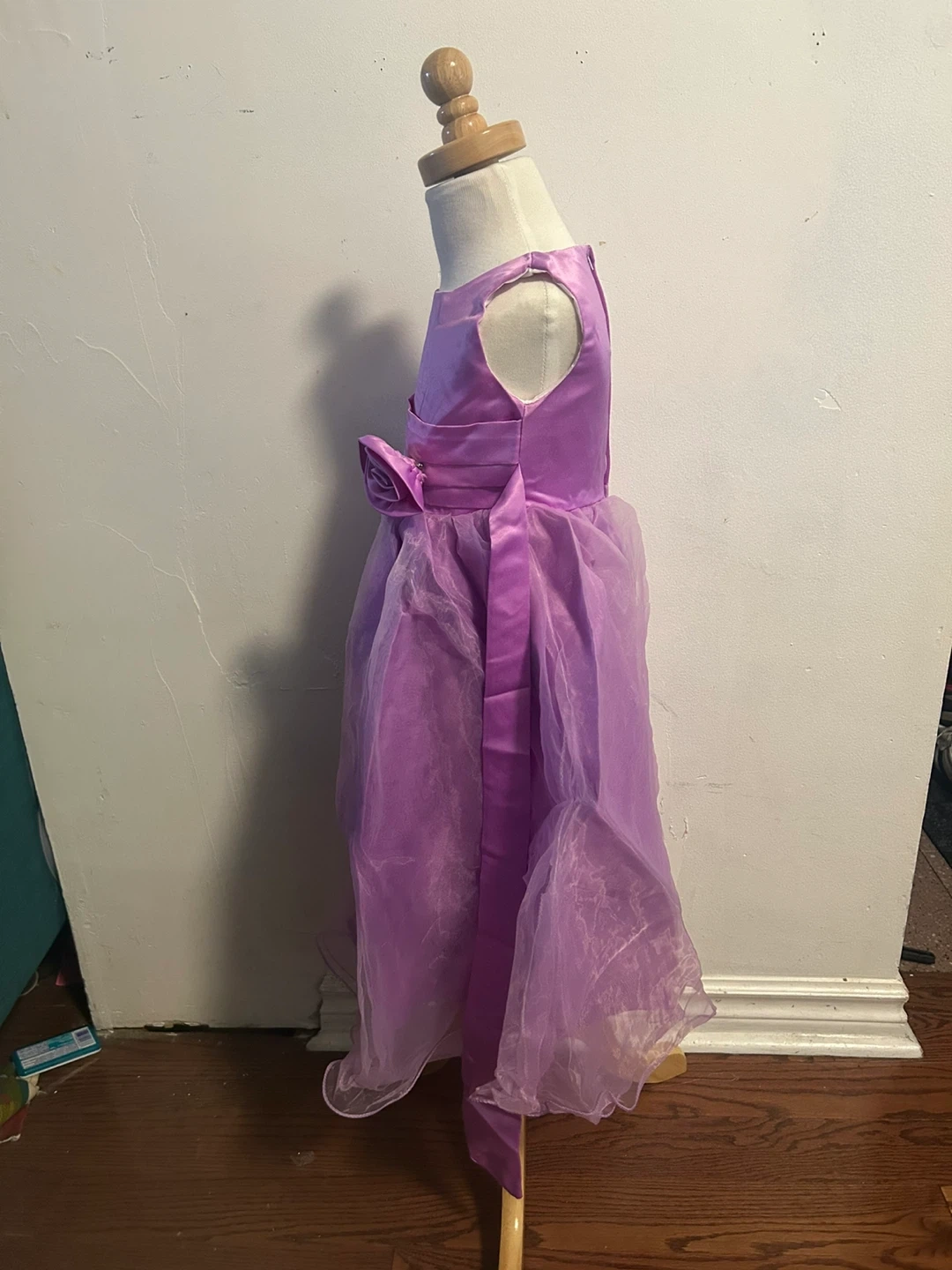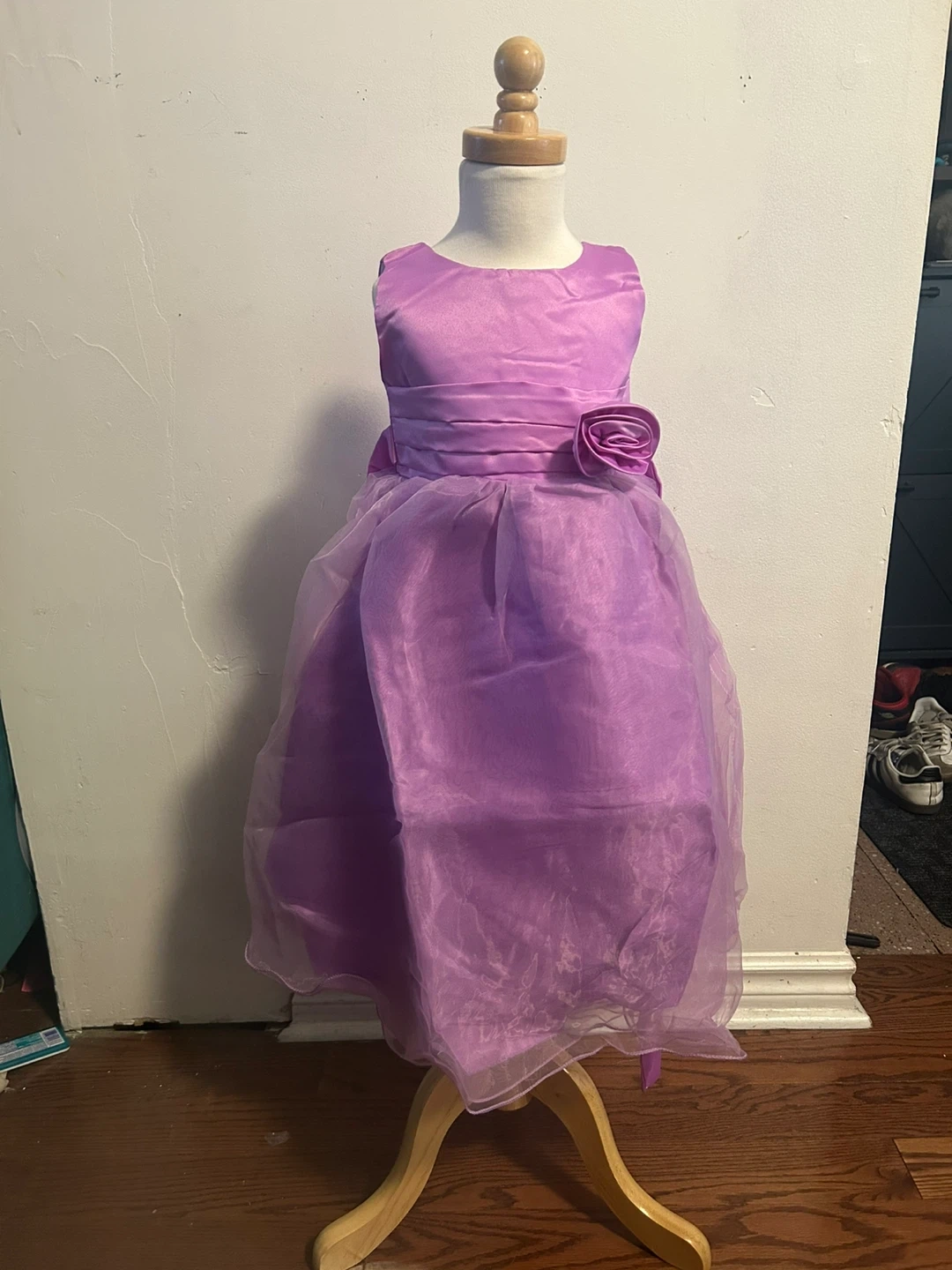 A cute purple flower girl dress! Perfect for a wedding or special occasion. It has a satin bodice and a layered tulle skirt. It's in great condition and ready for a new home