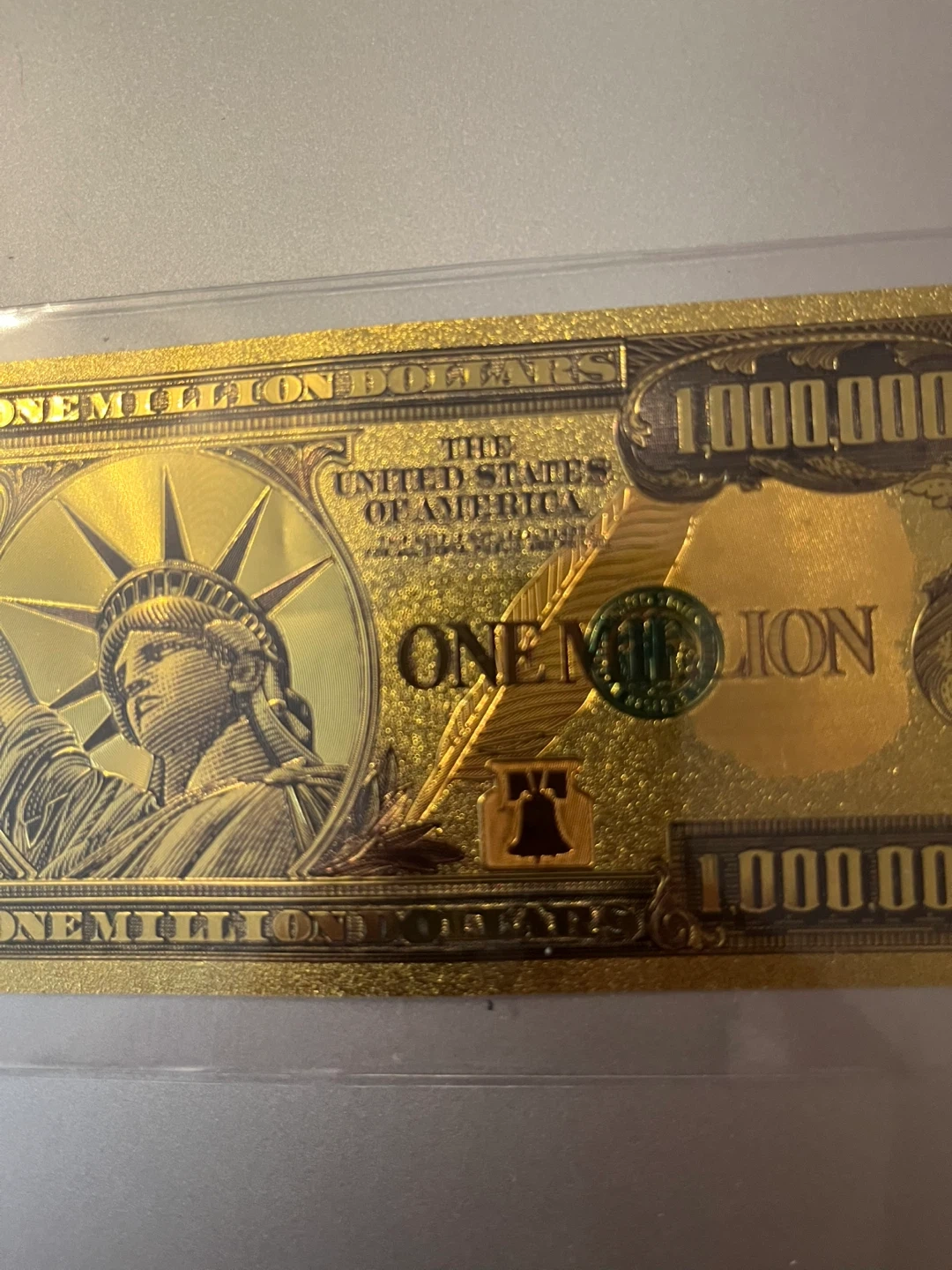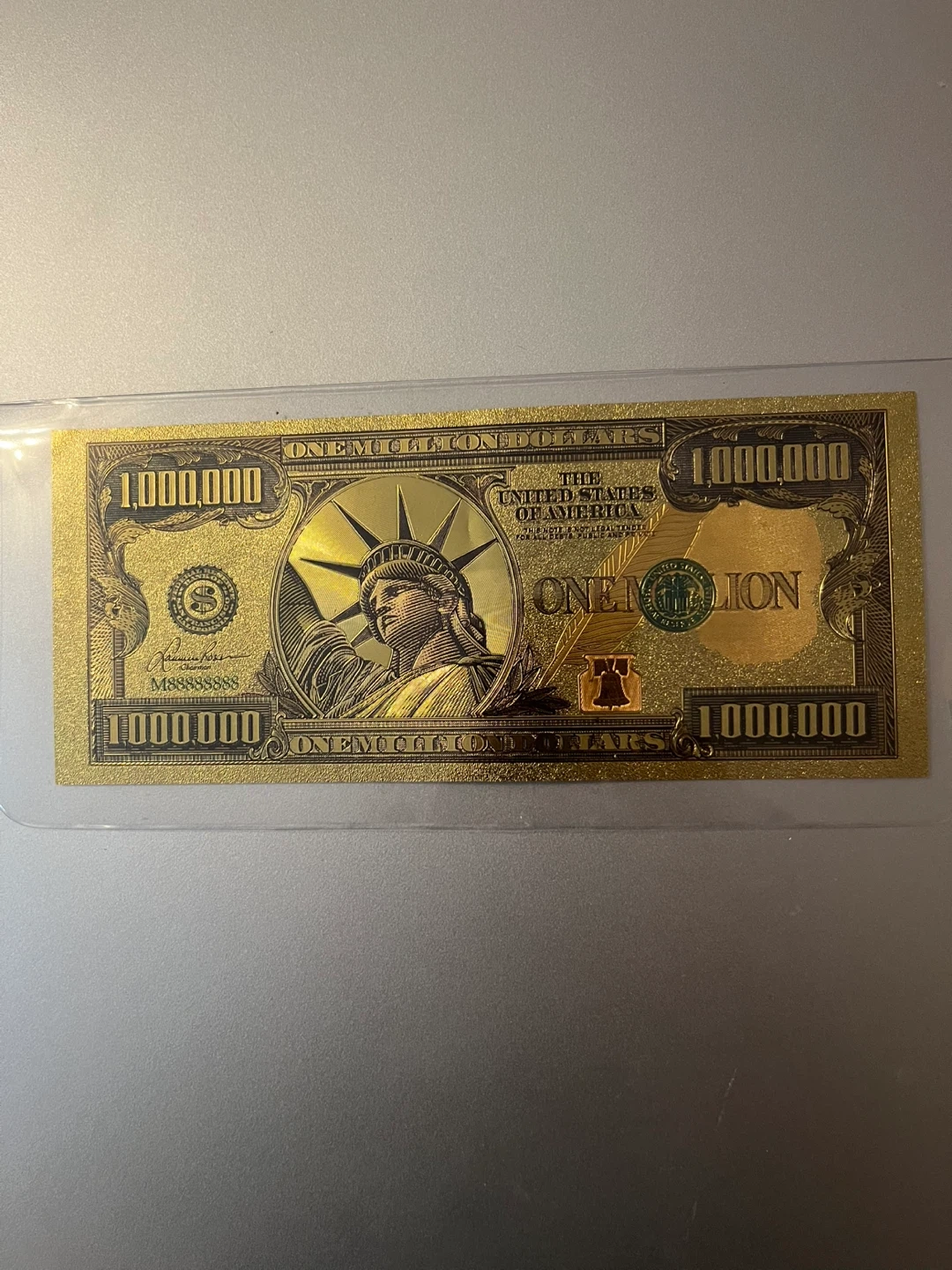 286This is a novelty one million dollar bill. It's gold in colour and features the Statue of Liberty and the US Capitol building