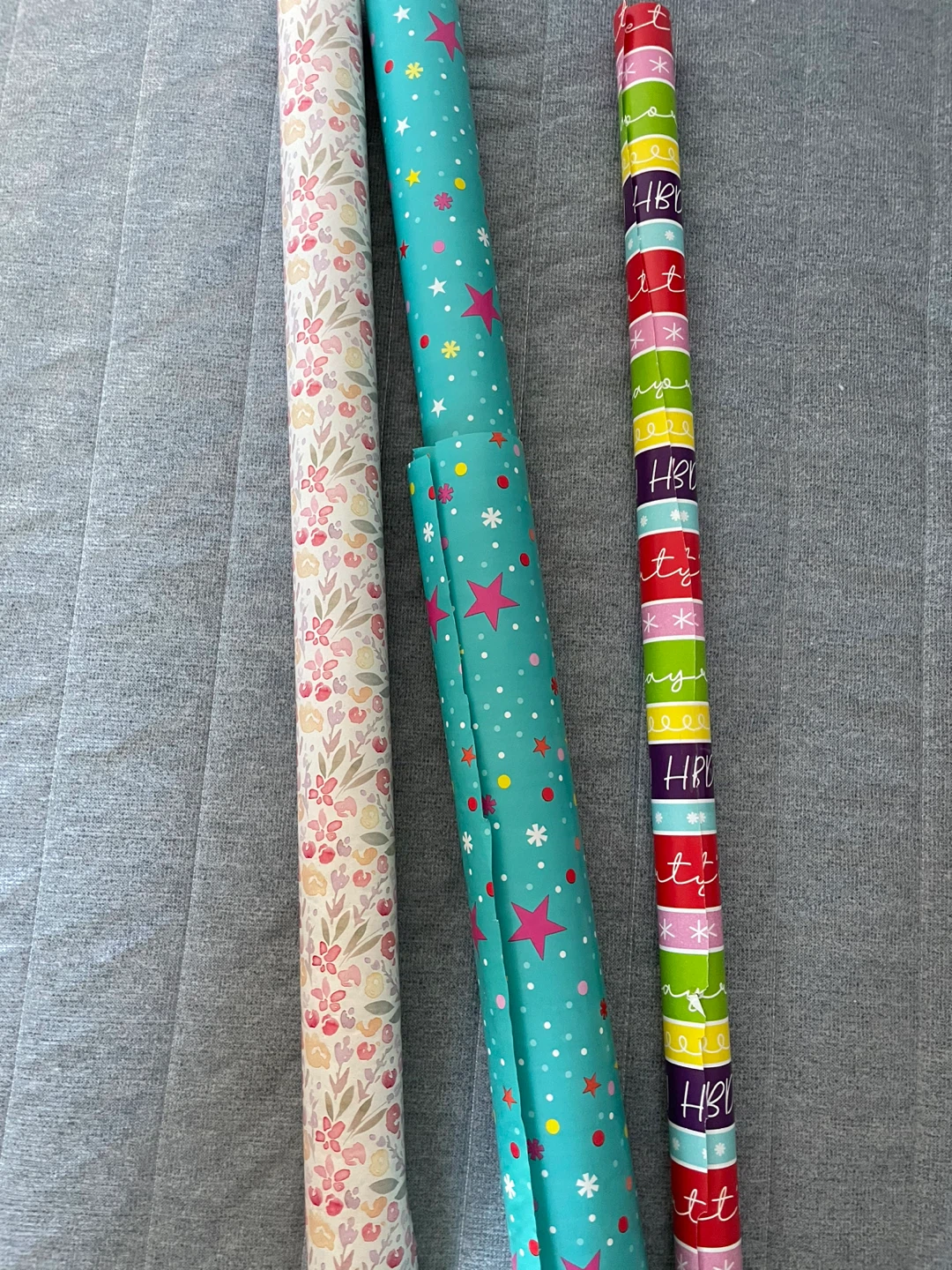 Giving away three rolls of gift wrapping paper. They have assorted patterns and colours, perfect for any occasion!