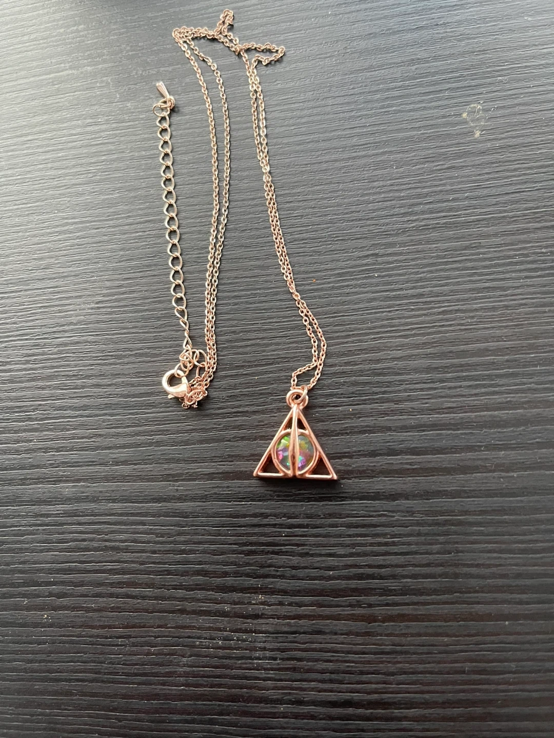 Selling a cute necklace with a Deathly Hallows pendant. It's in great condition and has a rose gold finish. Perfect for any Harry Potter fan!