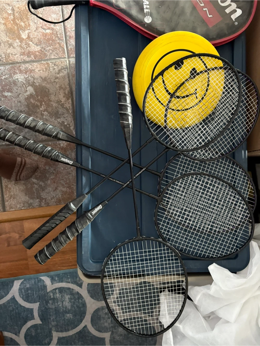 Selling a set of Cooper badminton rackets! (five) Also included is a fun smiley face disc for some extra outdoor fun.