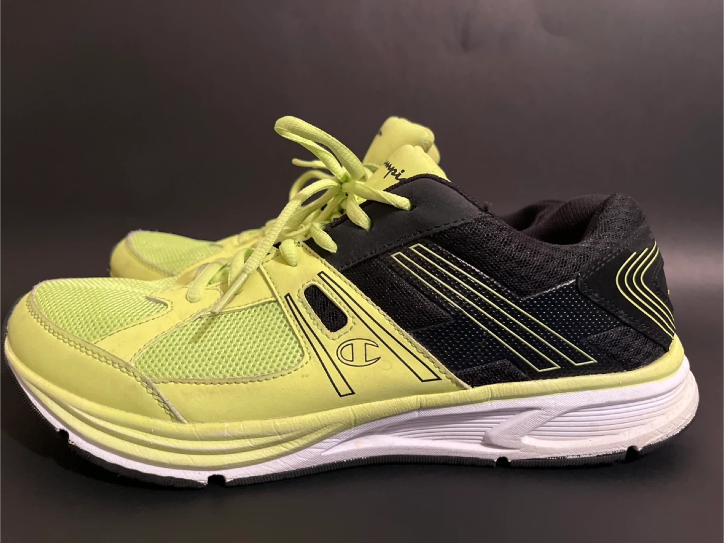 Selling a pair of Champion athletic shoes in size 12. They're a bright yellow-green colour with black accents. These shoes are in okay condition and ready for a new home!