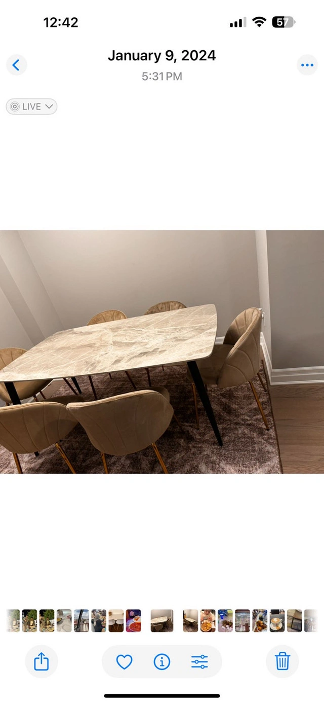 Elevate your dining space with this modern dining table set, featuring a faux marble top and six stylish, comfortable chairs. This used set is in good condition and ready to be the centerpiece of your dining area. Perfect for family dinners or entertaining guests! * Seats: 6 * Tabletop Material: Faux Marble * Chair Material: Velvet * Leg Finish: Black Looking to add a touch of elegance to your home? This dining set is your answer! If the ad is up, it's still available!