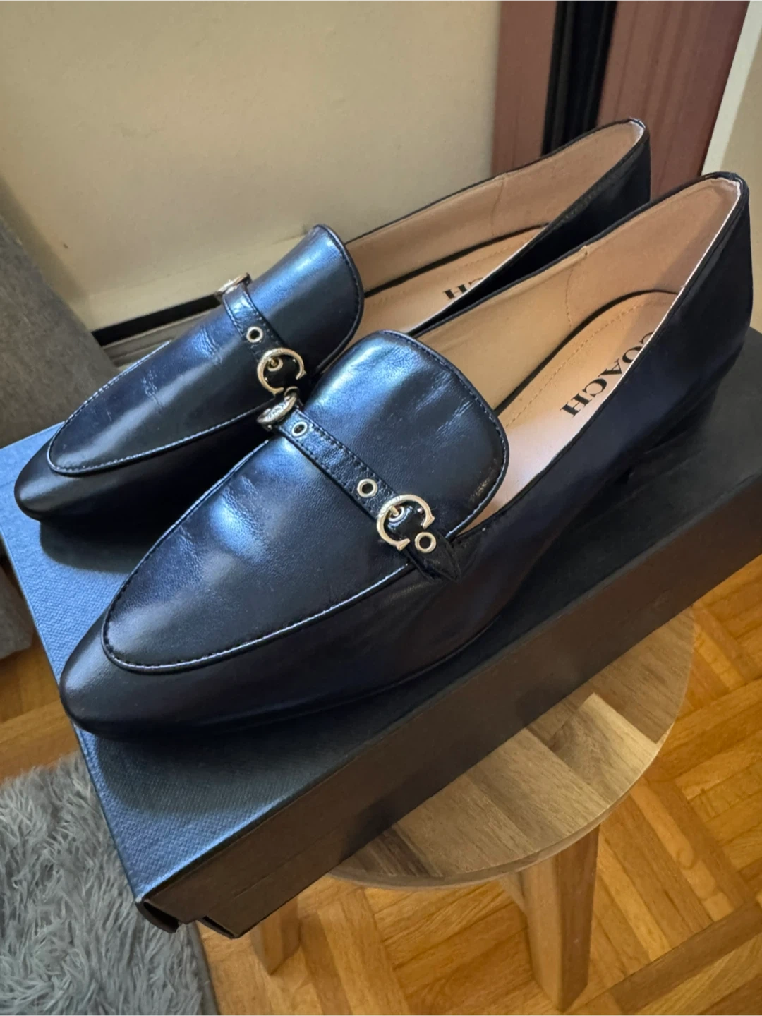 Selling a pair of Coach black leather loafers. They're in great condition and come with the original box. Perfect for adding a touch of class to any outfit!