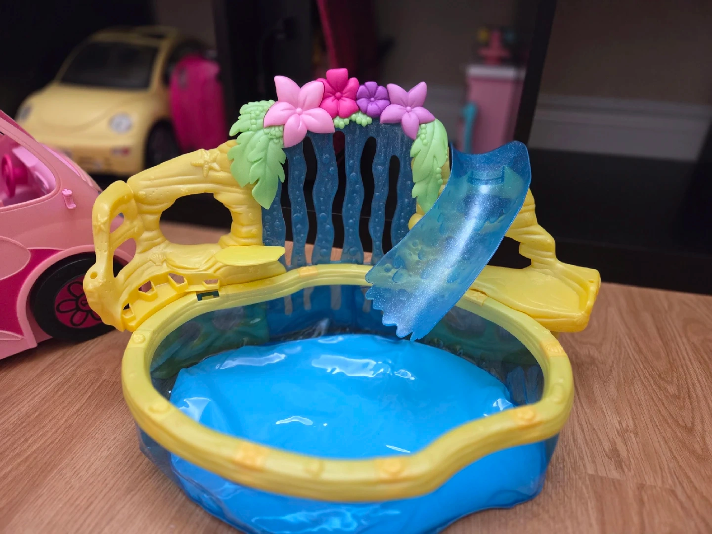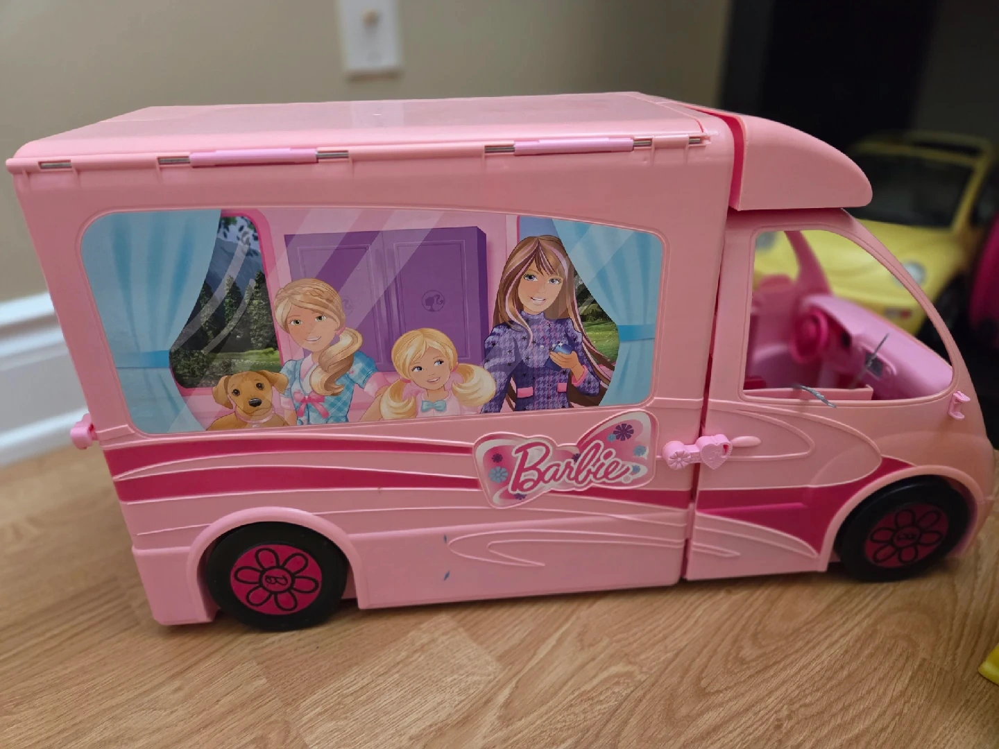 Selling a Barbie camper and pool playset! Great for imaginative play and Barbie adventures. The camper is pink and features fun details. The pool has a slide and floral accents