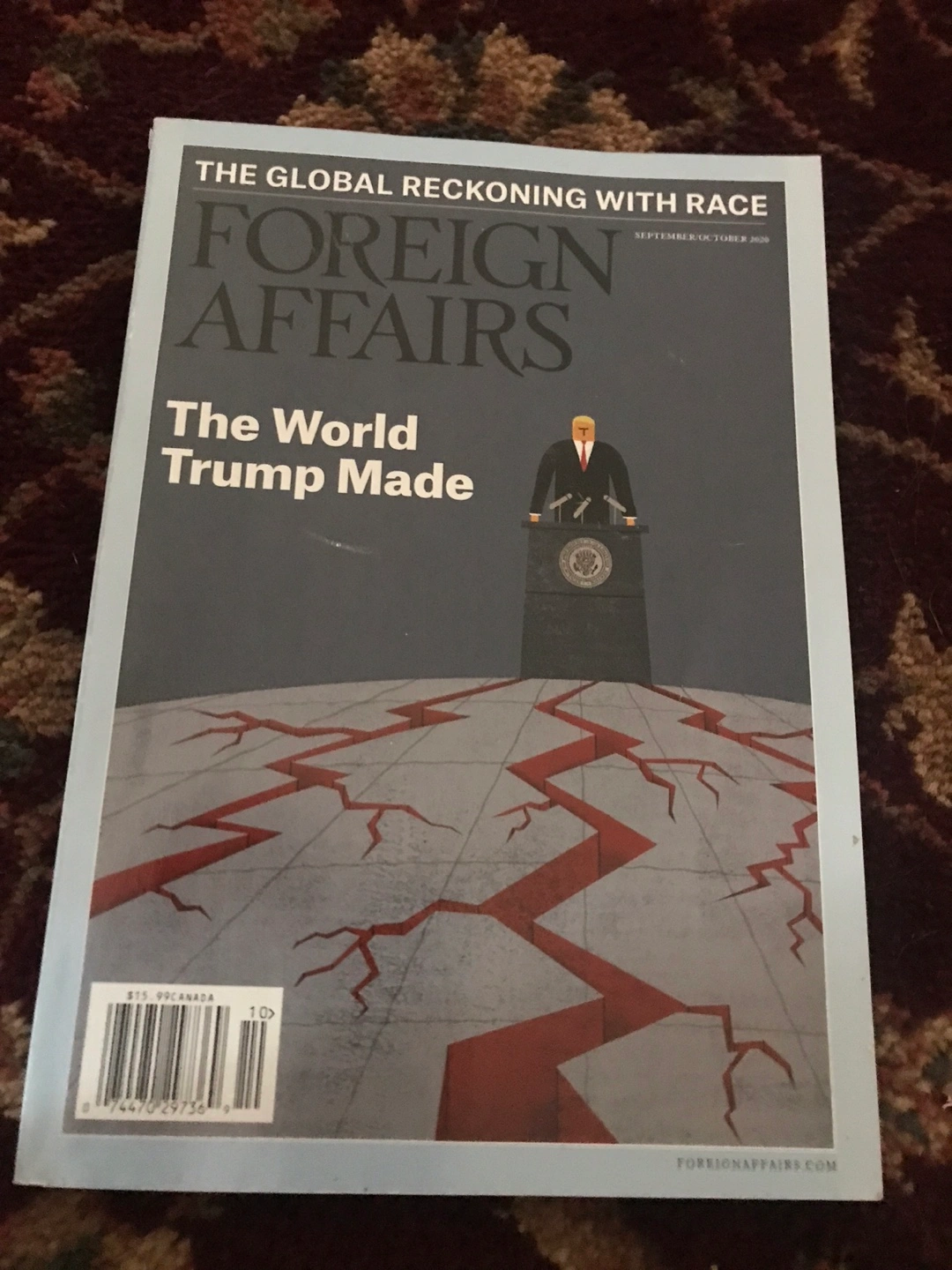 Selling a copy of Foreign Affairs Magazine from September/October 2020. The cover story is "The World Trump Made". Originally priced at $15.99 CAD