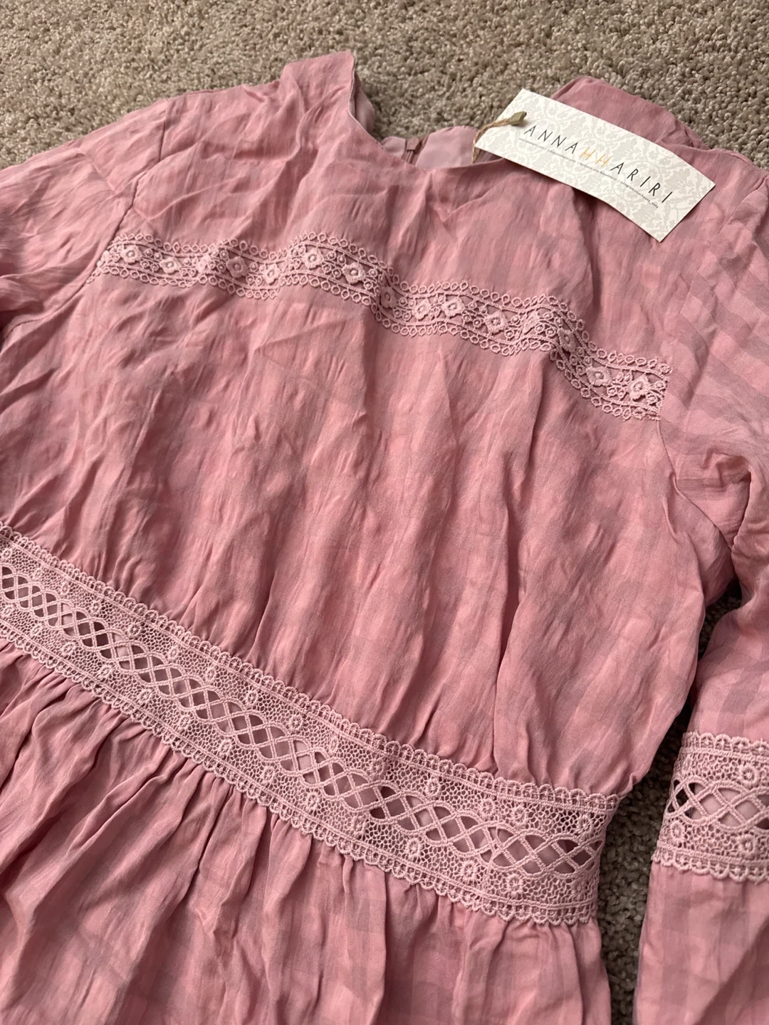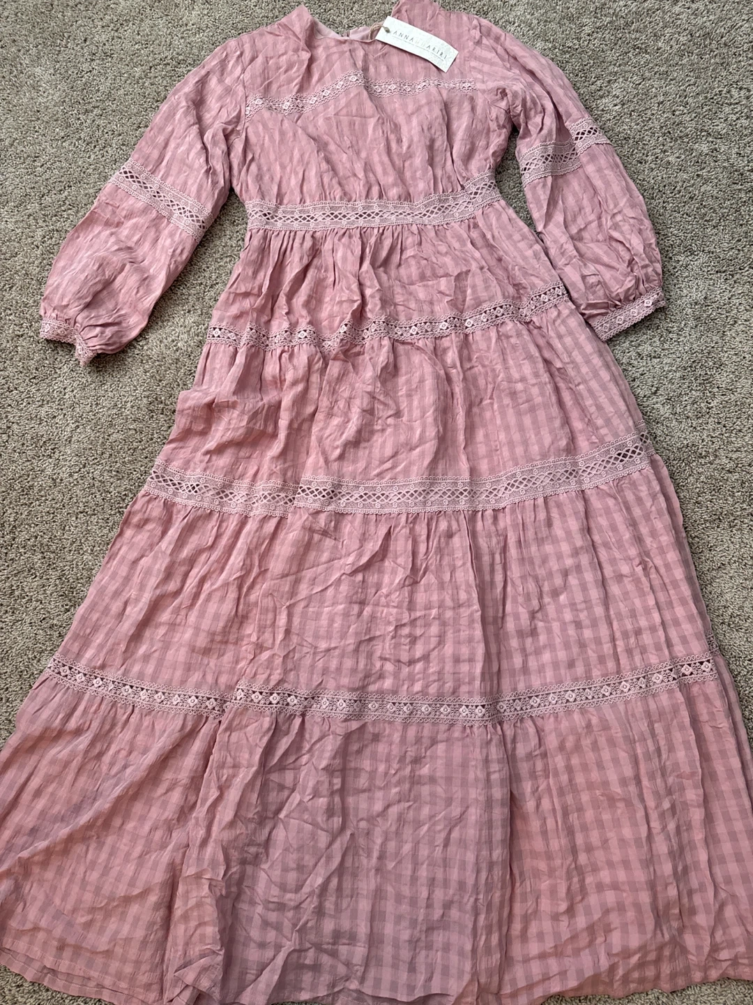 Selling a lovely ANNA HARIRI pink maxi dress. Size 14 US The dress features beautiful lace detailing and a tiered design. It's perfect for a special occasion or a stylish everyday look!