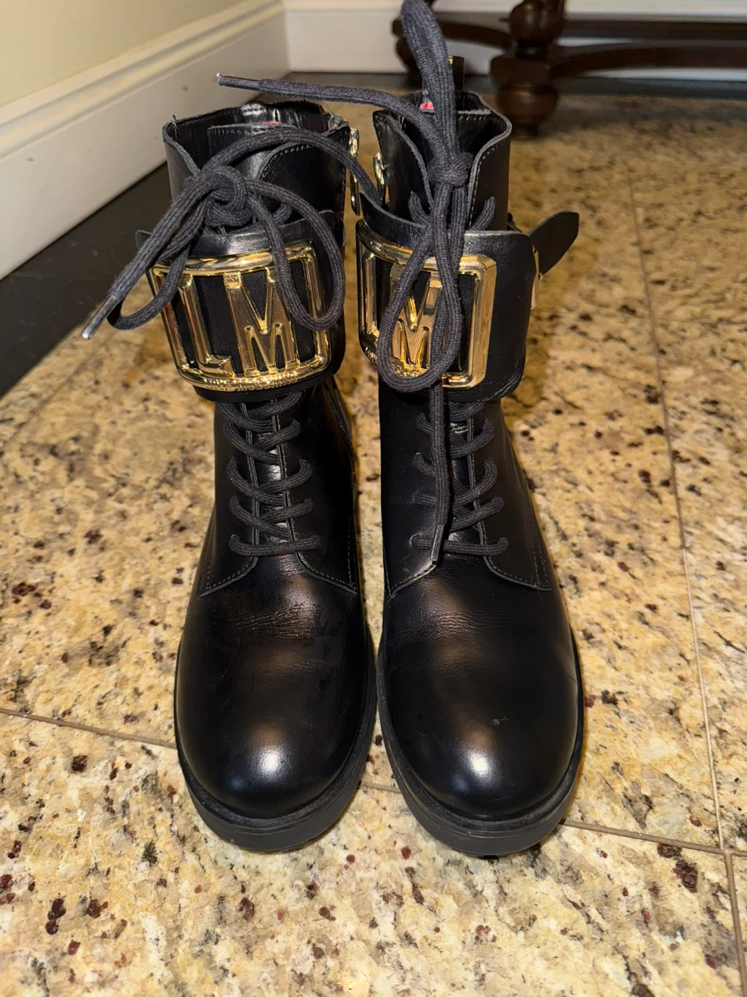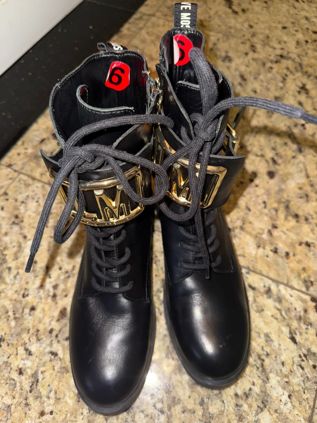 Selling a pair of Love Moschino black boots in size 6. They have a stylish design with gold accents and the brand name featured on the back. They are in brand new and ready for a new home!