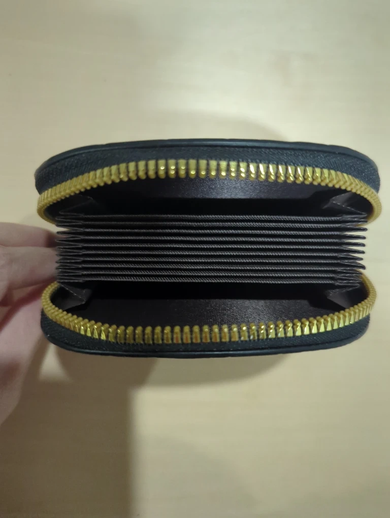 293This is a stylish black card holder with a patent leather finish and gold accents. It's perfect for keeping your cards organized and easily accessible. It has a unique crocodile skin pattern.