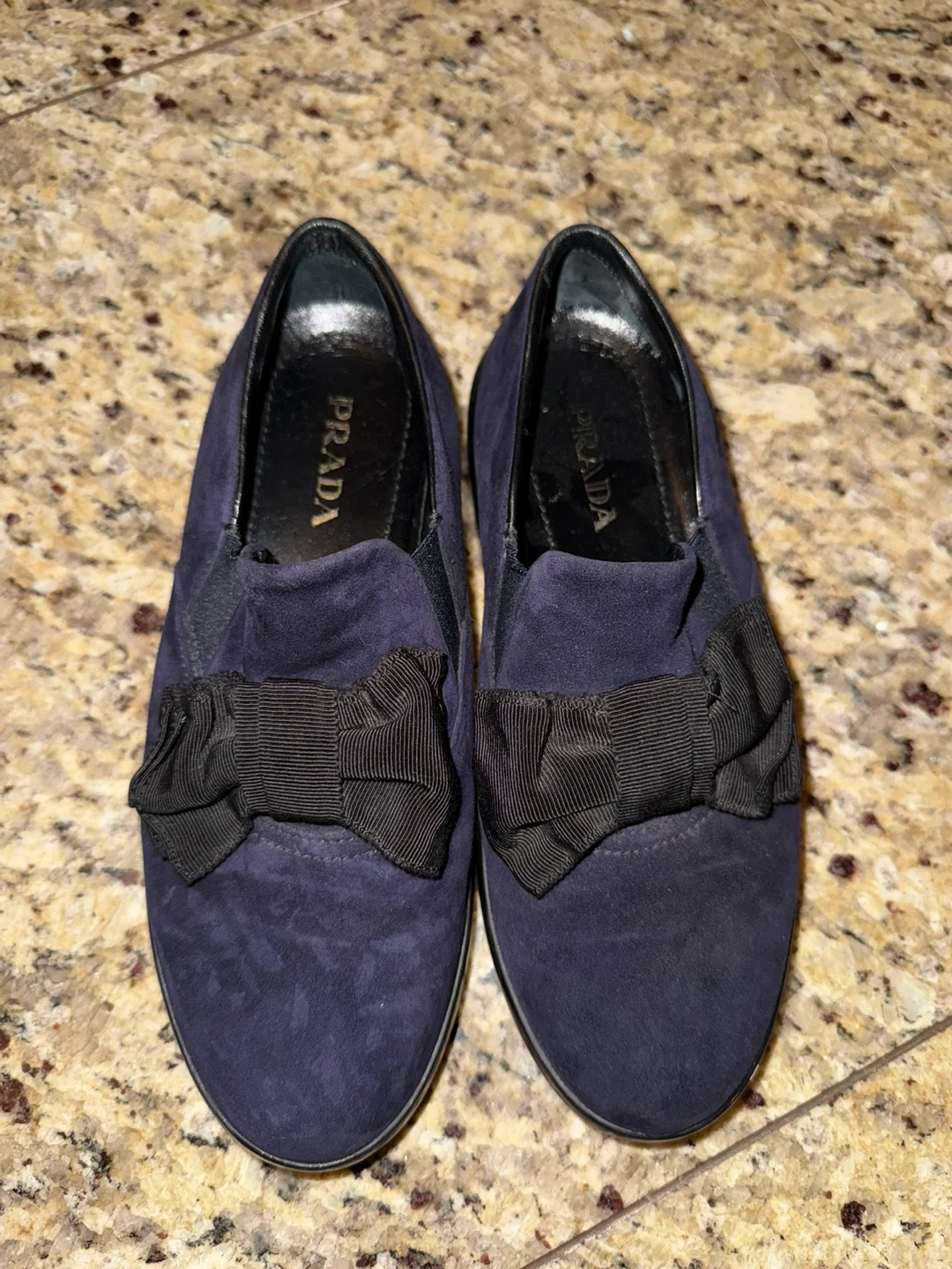 Selling a pair of Prada loafers in a beautiful navy suede! They feature a cute bow detail and are a size US 7 (37 1/2).Perfect for adding a touch of elegance to any outfit