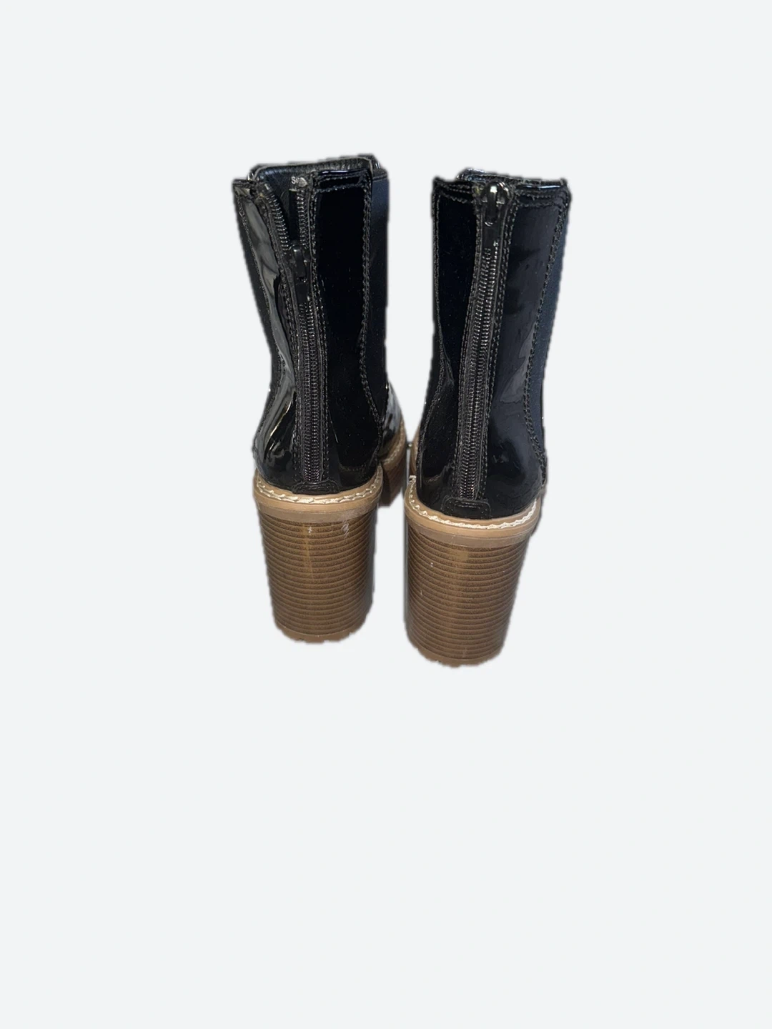 These are a pair of stylish black patent ankle boots. They feature a chunky heel and a zipper at the back. Perfect for adding a bit of edge to any outfit!