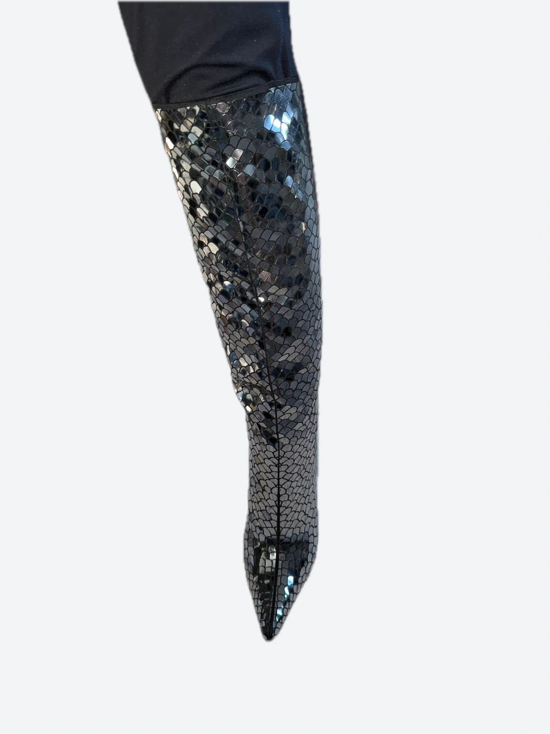 Stylish thigh-high heel boots with a unique snakeskin-like pattern in a dark metallic colour. Perfect for adding a touch of edgy elegance to any outfit! Size 8