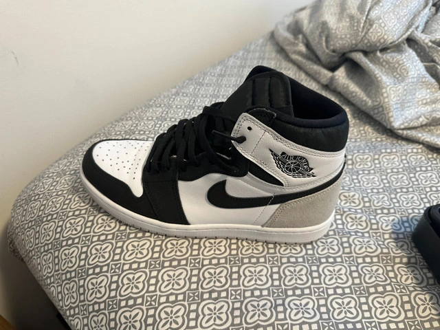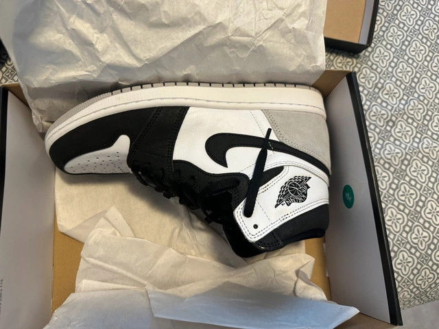 Step up your shoe game with these Nike Air Jordan 1s in a stylish black, white, and grey colourway, size 9.5. These shoes are in used, but good condition, ready to make a statement on the streets or the court. They come complete with the original box and an extra pair of laces, adding versatility to your look. Brand: Nike Model: Air Jordan 1 Colour: Black/White/Grey Size: 9.5 Condition: new Looking for a fresh pair of kicks? These Air Jordan 1s are ready to be laced up and taken out. But don't wait too long, because if the ad is still up, they're still available!