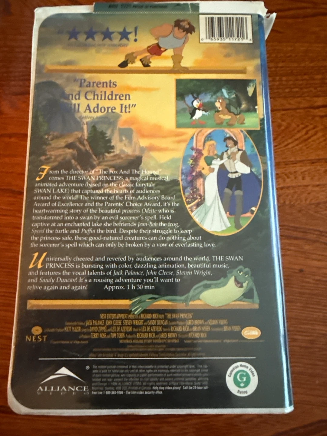 Selling The Swan Princess VHS tape! This is a magical musical animated adventure that features dazzling animation, beautiful music, and the voices of Jack Palance, John Cleese, Steven Wright, and Sandy Duncan. It's approximately 1 hour and 30 minutes long. Parents and children will adore it!