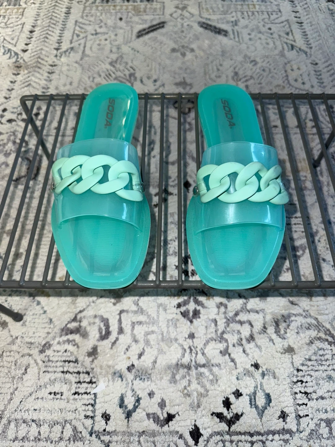 These aqua SODA brand slide sandals feature a fun chain detail! They're in great condition and ready for a new home