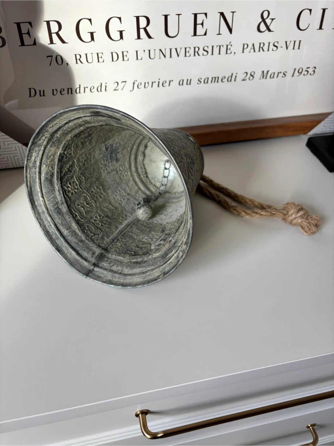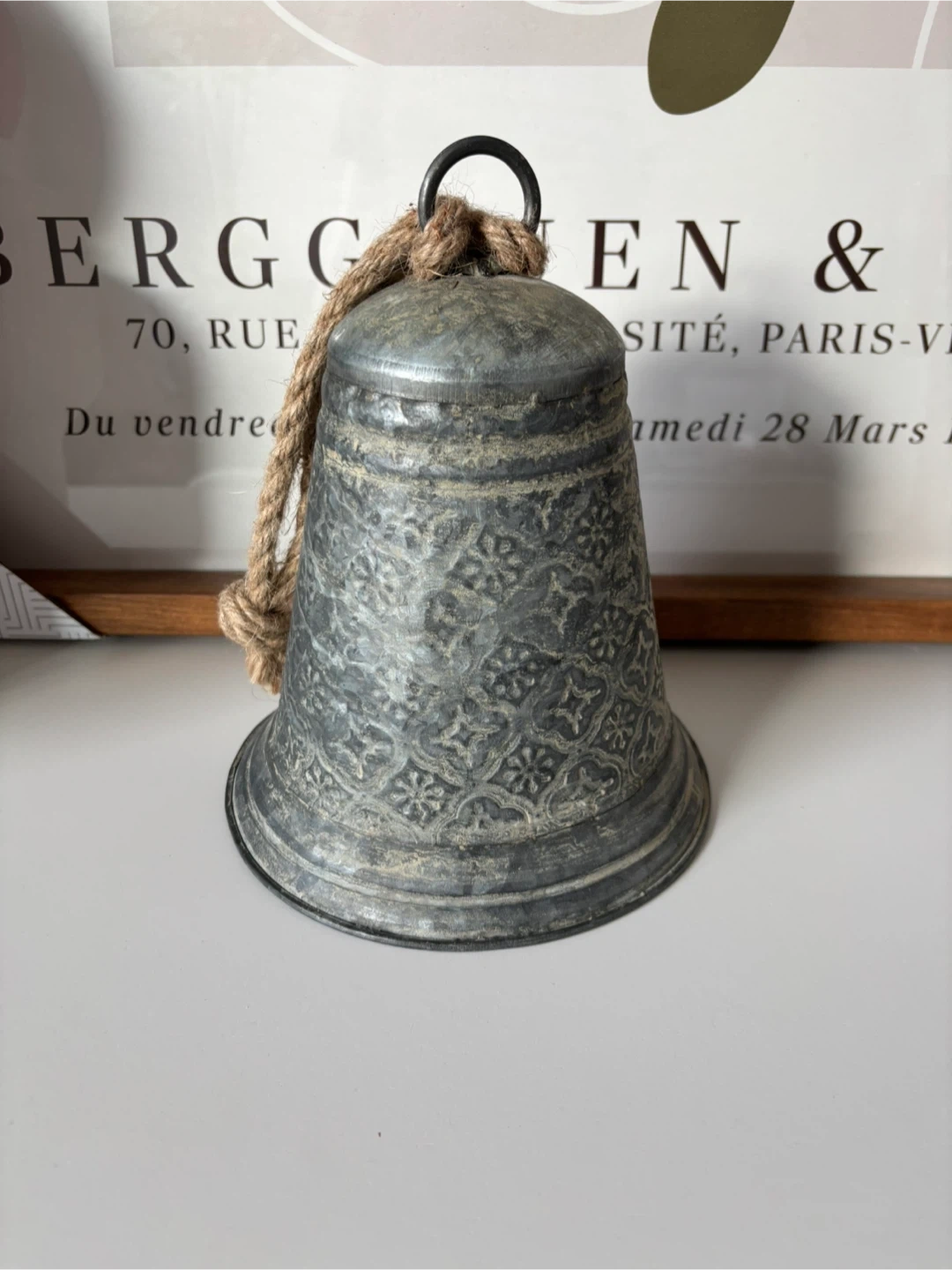 Add a touch of rustic charm to your home with this metal bell! It features a lovely embossed pattern and a sturdy rope hanger. It measures approximately 8.5” height, perfect for adding a vintage touch to any space.