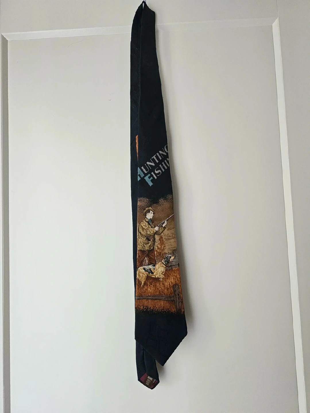 Polo selling a novelty necktie with a hunting and fishing theme. The tie features a detailed scene with a hunter, a dog, and a rustic fence. It's a unique piece for anyone interested in outdoor activities or vintage fashion