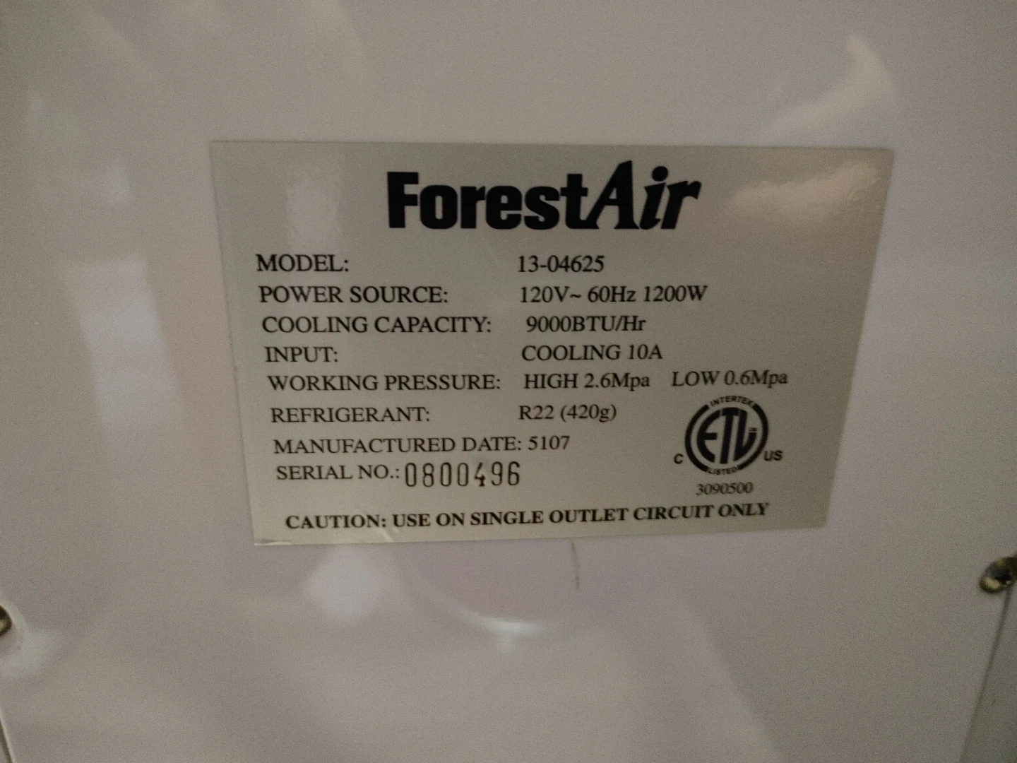 67Selling a Forest Air portable air conditioner. It's in good working condition and ready to keep you cool! The model number is 13-04625. It has a cooling capacity of 9000BTU/Hr and uses R22 refrigerant