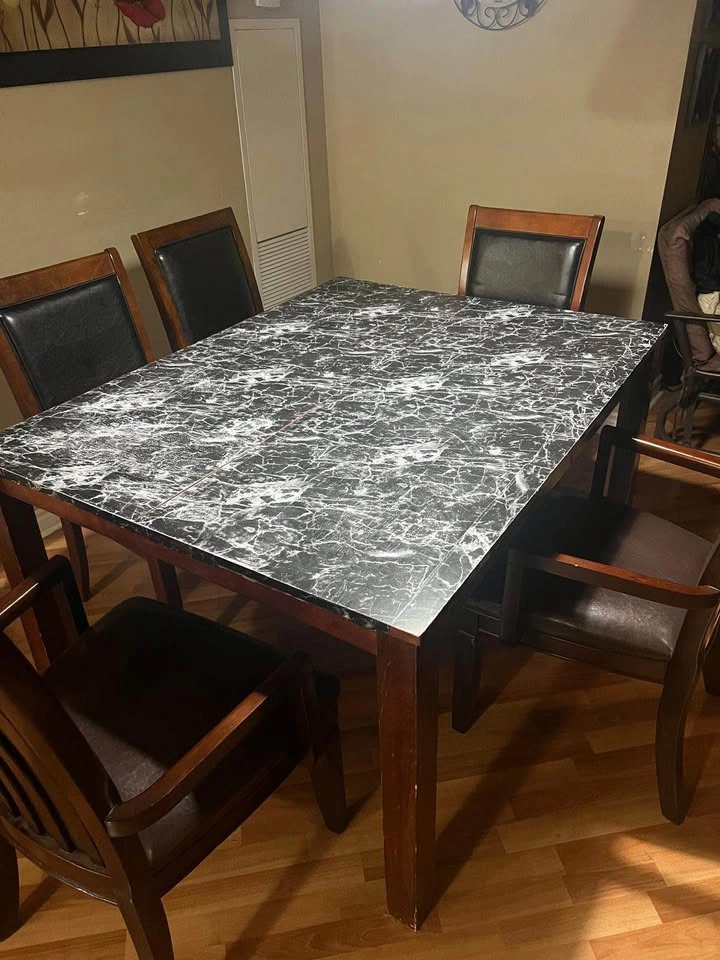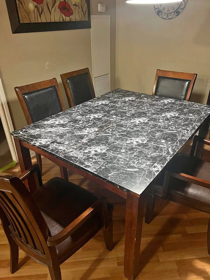 Dining Table Set. Used - Fair Quality. Dark brown wood set. 5 chairs included. 1 chair needs fixing. Some scratches overall. Pickup near square one.