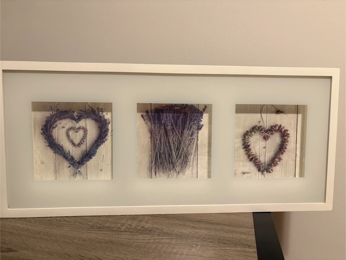 This framed wall art features a lovely lavender heart design. It would look great in any room of the house