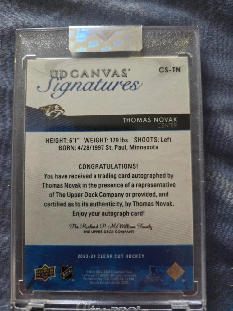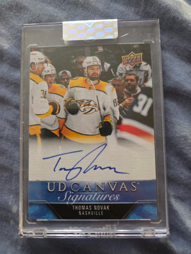 Selling a Thomas Novak autographed trading card! It's from the UD Canvas Signatures series and appears to be in great condition. A nice collectible for any hockey fan!