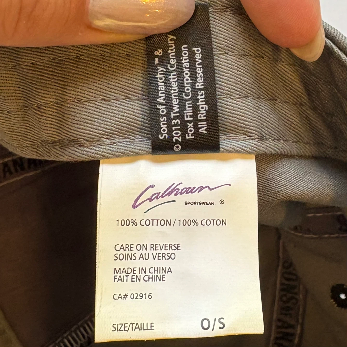 This authentic Sons of Anarchy (SOA) baseball cap is a must-have for any fan of the show. It features the SAMCRO (Sons of Anarchy Motorcycle Club, Redwood Original) logo embroidered on the front panel and "Reaper Crew" embroidered on the side, along with the anarchy symbol on the other. The two-tone design of black and grey with contrasting white stitching gives it a bold, biker aesthetic. Made from 100% cotton by Calhoun Sportswear, this adjustable cap has a back metal buckle closure and is labeled as One Size (O/S), making it a comfortable fit for most. This hat is officially licensed by Twentieth Century Fox Film Corporation, as noted on the interior tag.