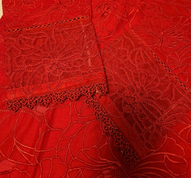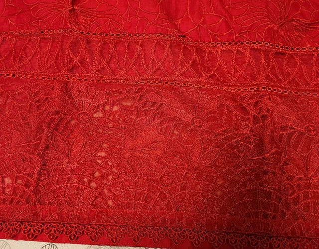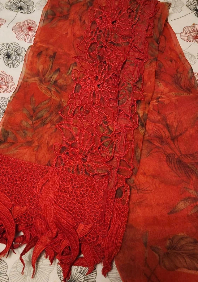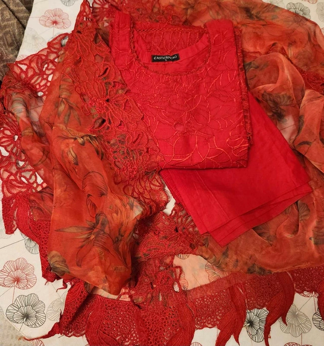 Beautiful 3 pcs cutwork suit with lace work. Plain trousers. Soft organza cutwork dupatta. Size large. Brand new. Check other listings too. Door pick up also available.