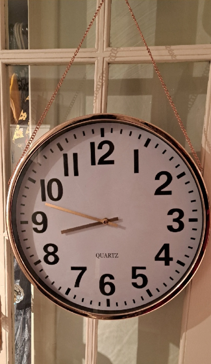 Selling a lovely rose gold hanging wall clock! It's in great shape and would look beautiful in any room.