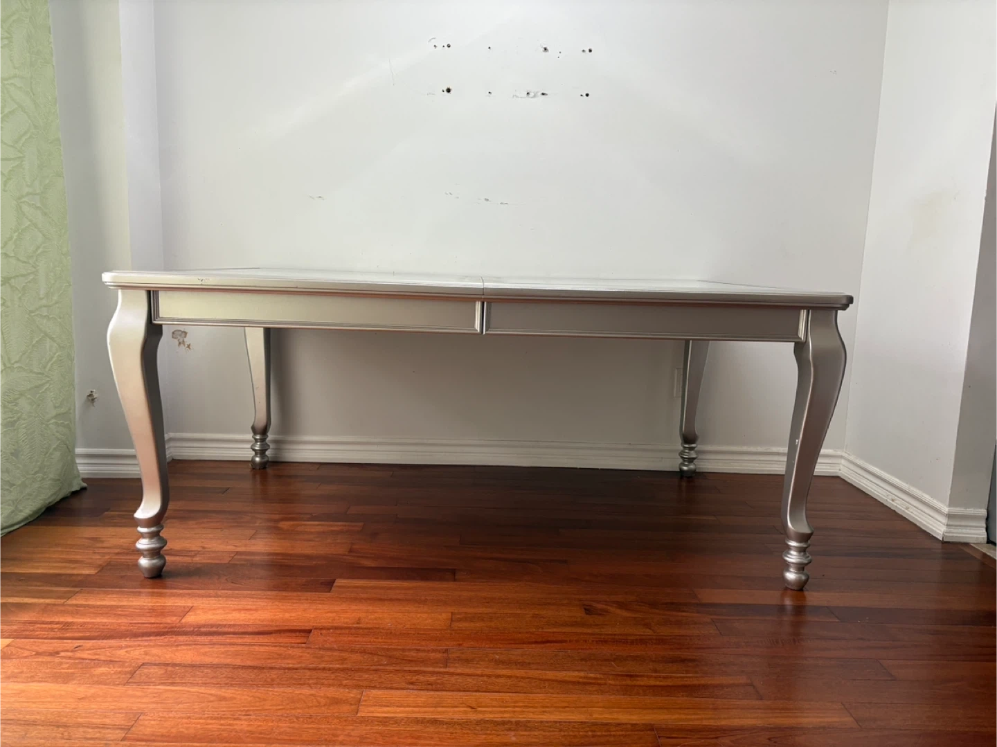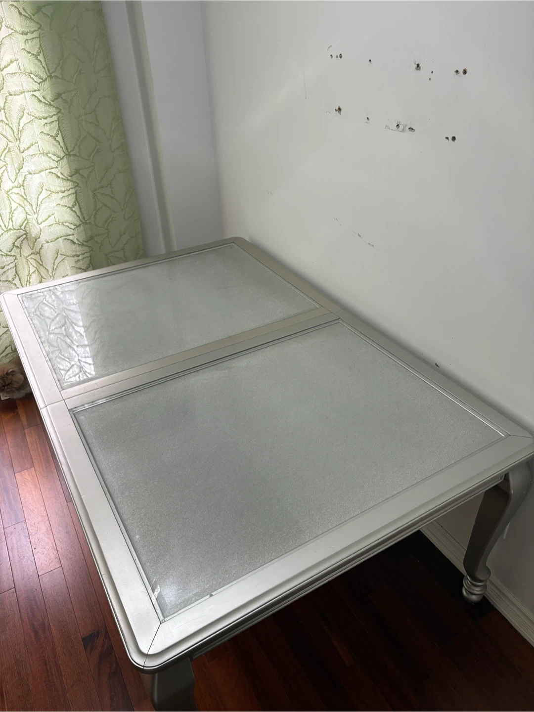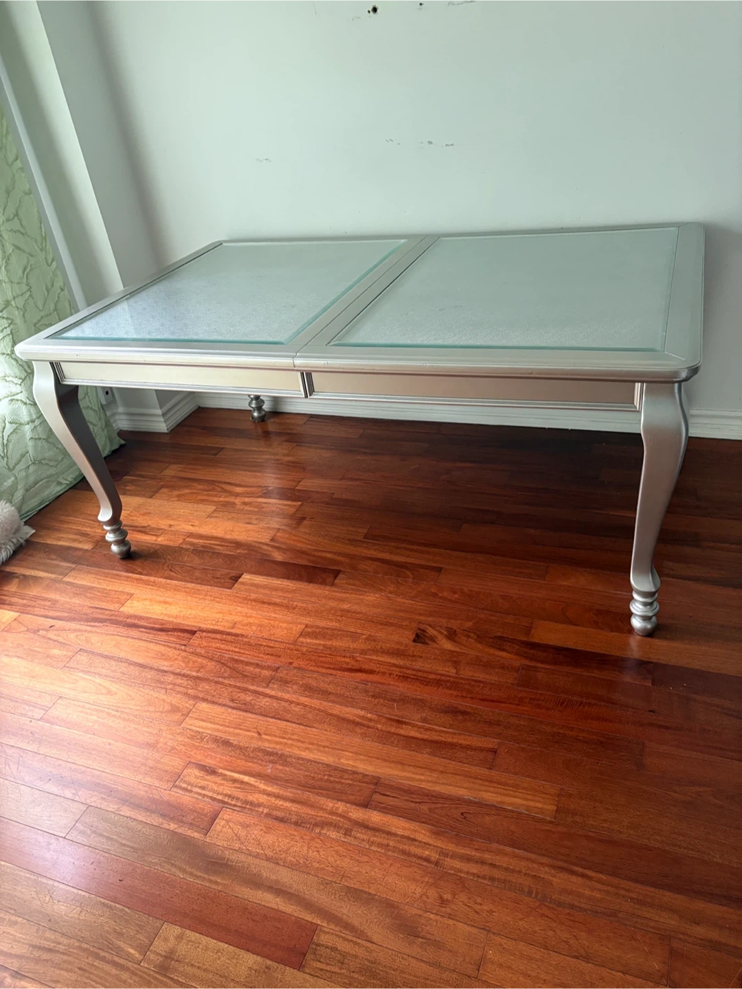Selling a dining table with a silver frame and a glass top. Quality wood and very sturdy. Barely used and it's in a very good condition. Would be a great addition to any dining room, and will match any chair set. Comes with an extension leaf that never been used. Originally purchased for $1000. The table has a classic design with ornate legs. I can disassemble it for you!
