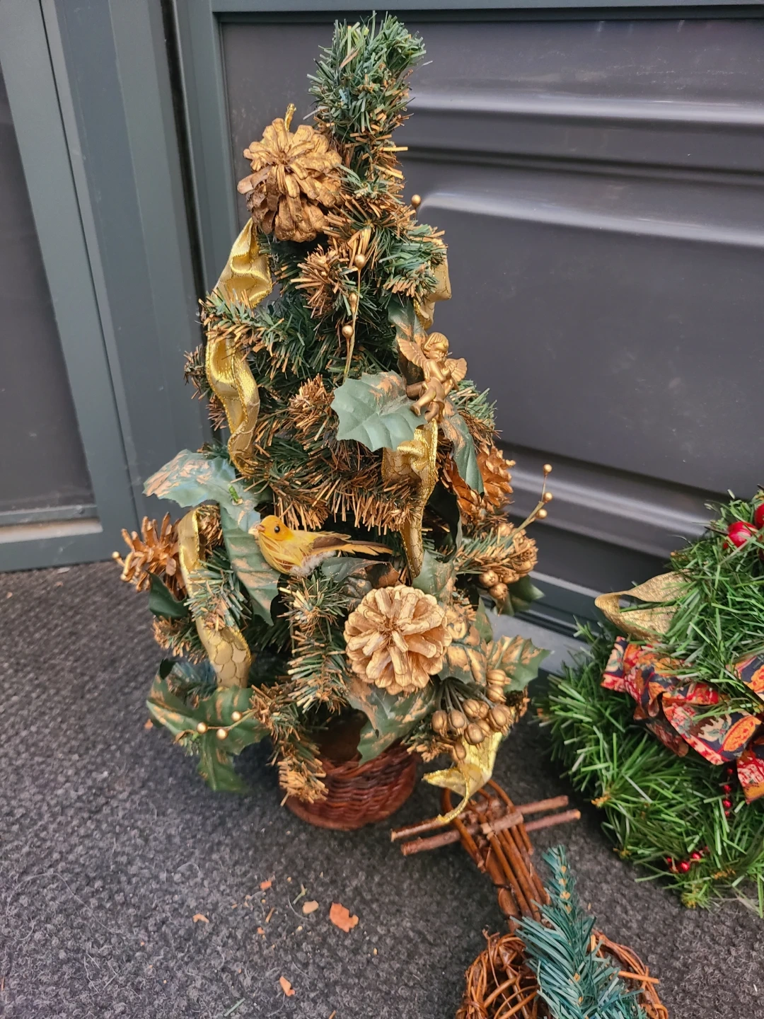 Selling a set of Christmas decorations to brighten up your home this holiday season! The set includes a small decorated Christmas tree, a festive wreath, and a decorative violin made of twigs and adorned with festive elements