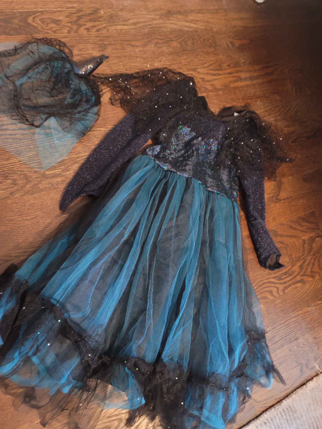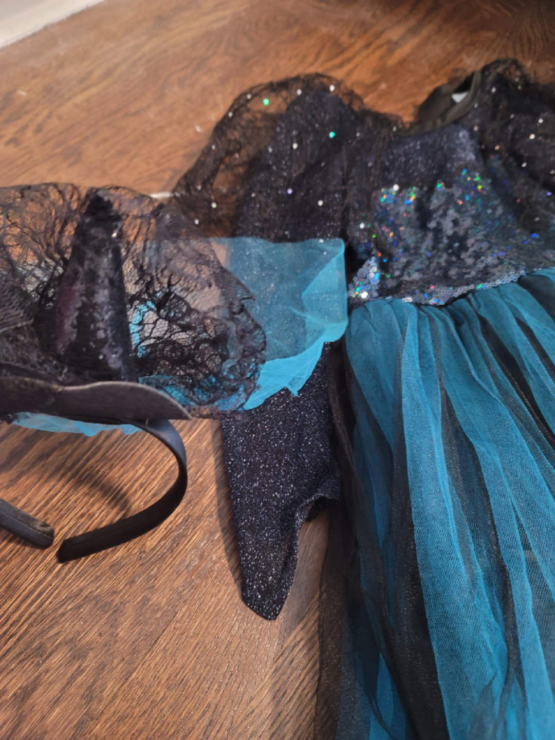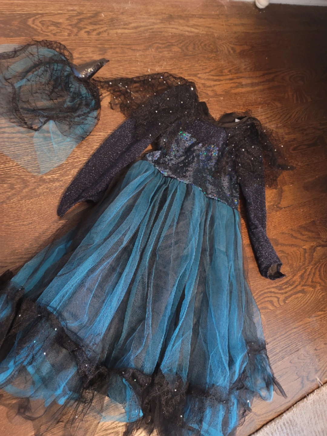 Selling a girl's witch costume. It features a black and teal color scheme with sequin details on the bodice and sparkly accents on the sleeves. The costume includes a dress, a headband, and a matching witch hat! Perfect for Halloween or dress-up play