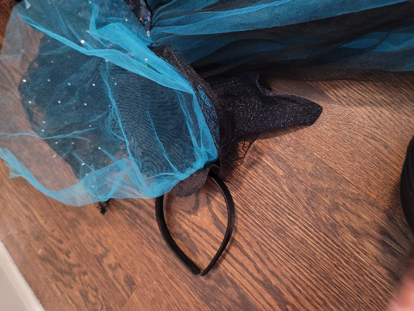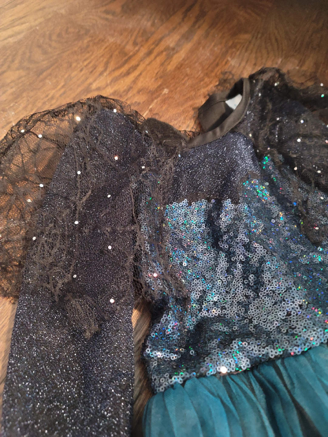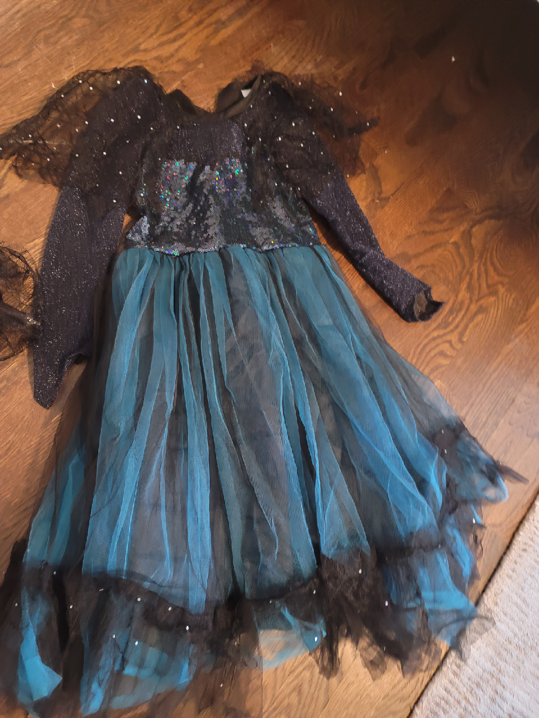 Selling a girl's witch costume. It features a black and teal color scheme with sequin details on the bodice and sparkly accents on the sleeves. The costume includes a dress, a headband, and a matching witch hat! Perfect for Halloween or dress-up play