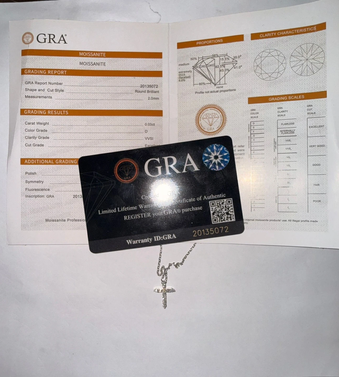 Selling a beautiful moissanite cross pendant necklace. The stone is a round brilliant cut, 2.0mm in size, with a colour grade of D and clarity grade of VVS1. It's a lovely piece!
