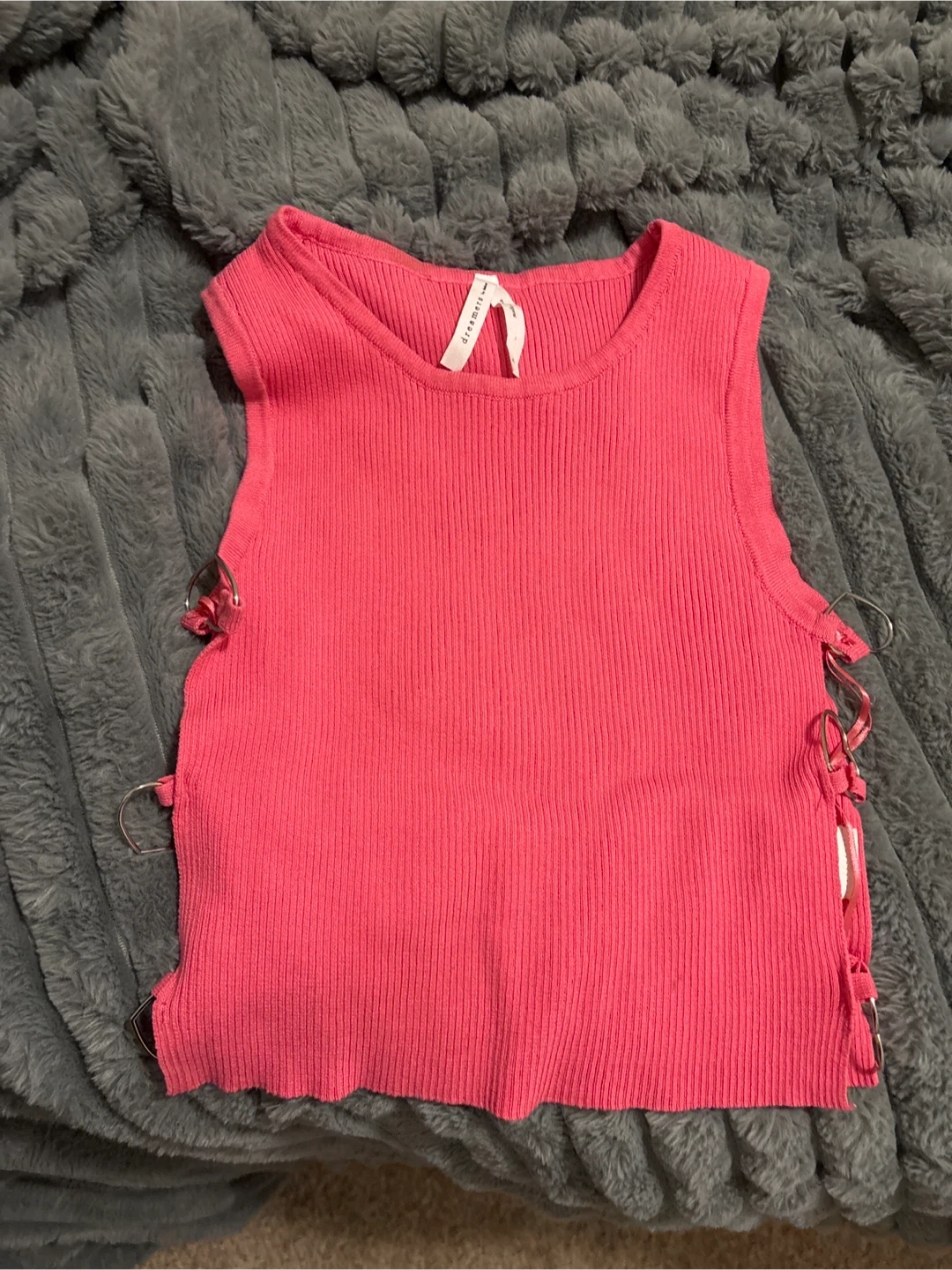 Selling a cute pink tank top from Stitches! It's in great condition and features a ribbed texture and unique heart-shaped ring details on the sides. Perfect for adding a pop of colour to your wardrobe