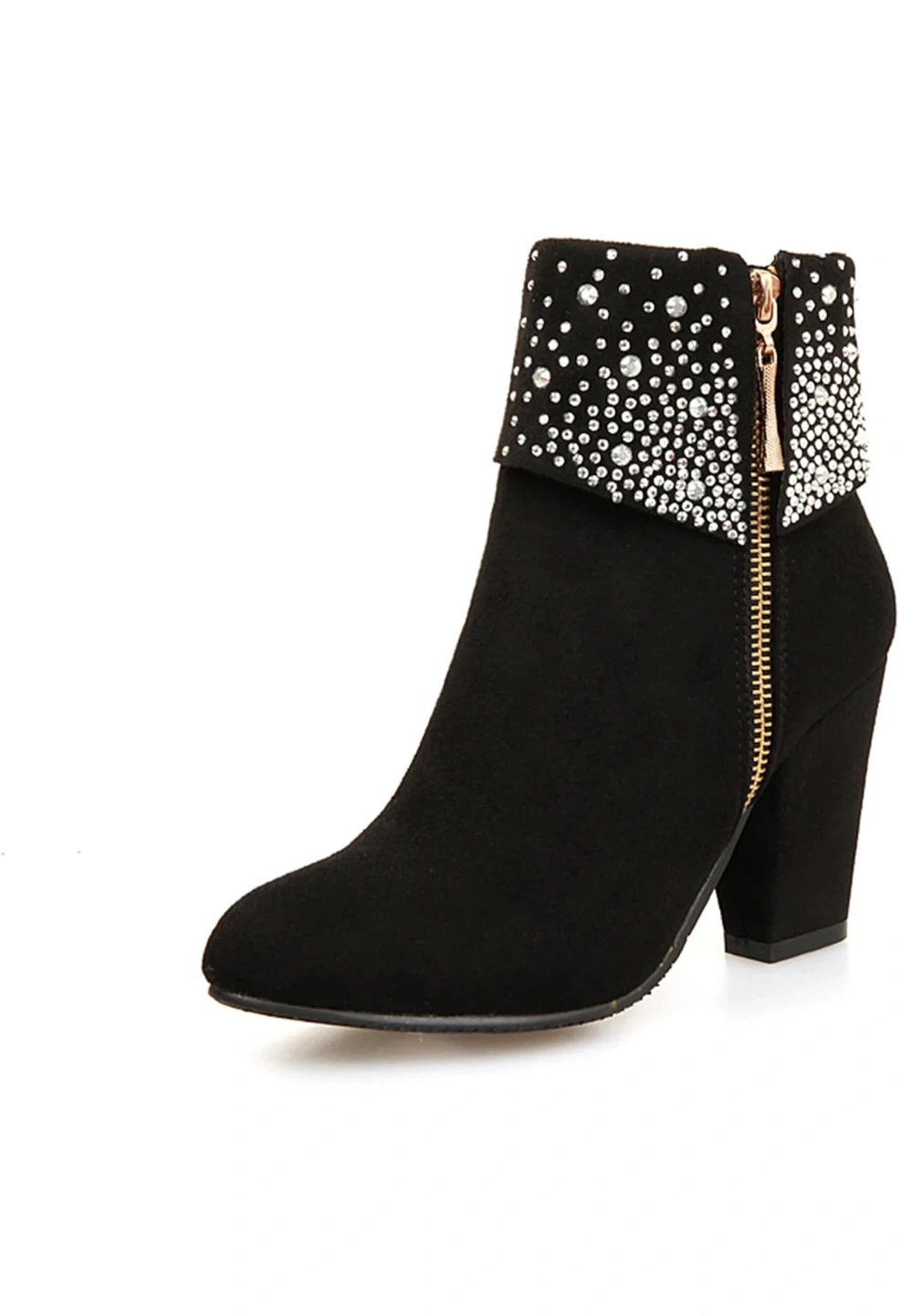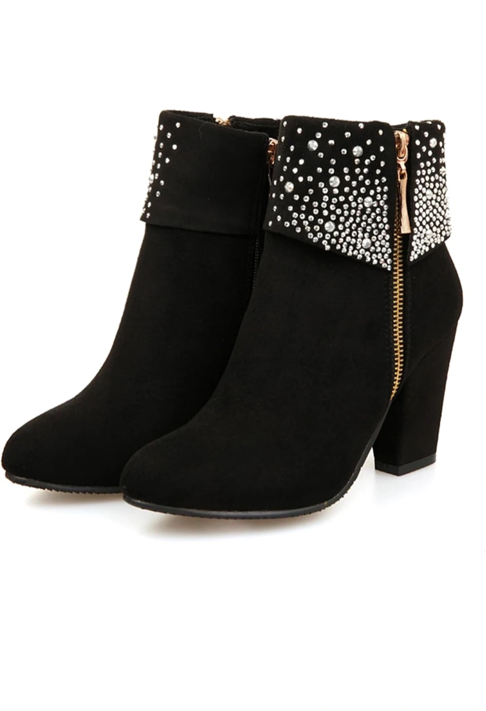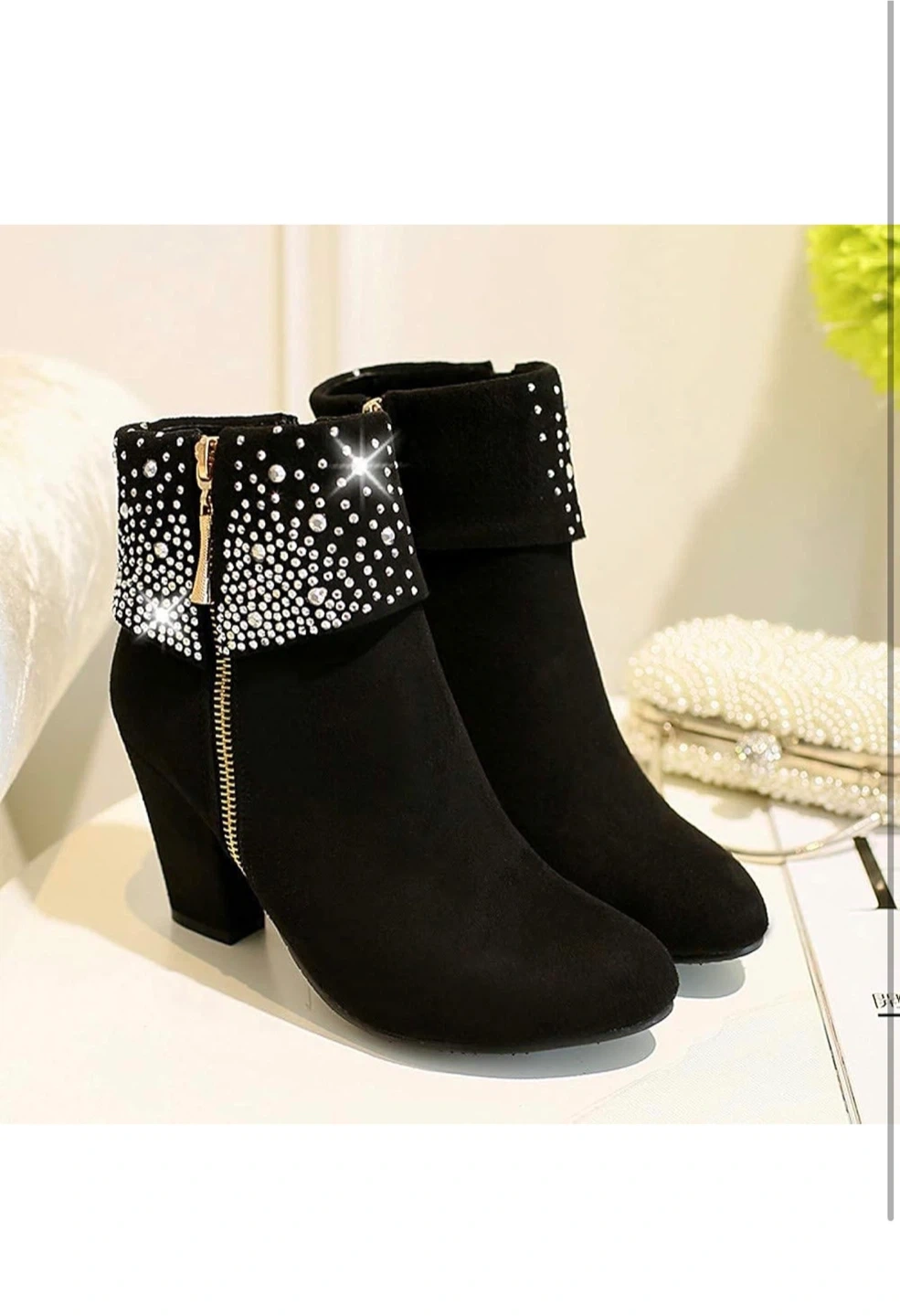 Cute black ankle boots with a block heel and rhinestone detailing around the top. They have a gold zipper on the side for easy on and off. Perfect for dressing up any outfit!