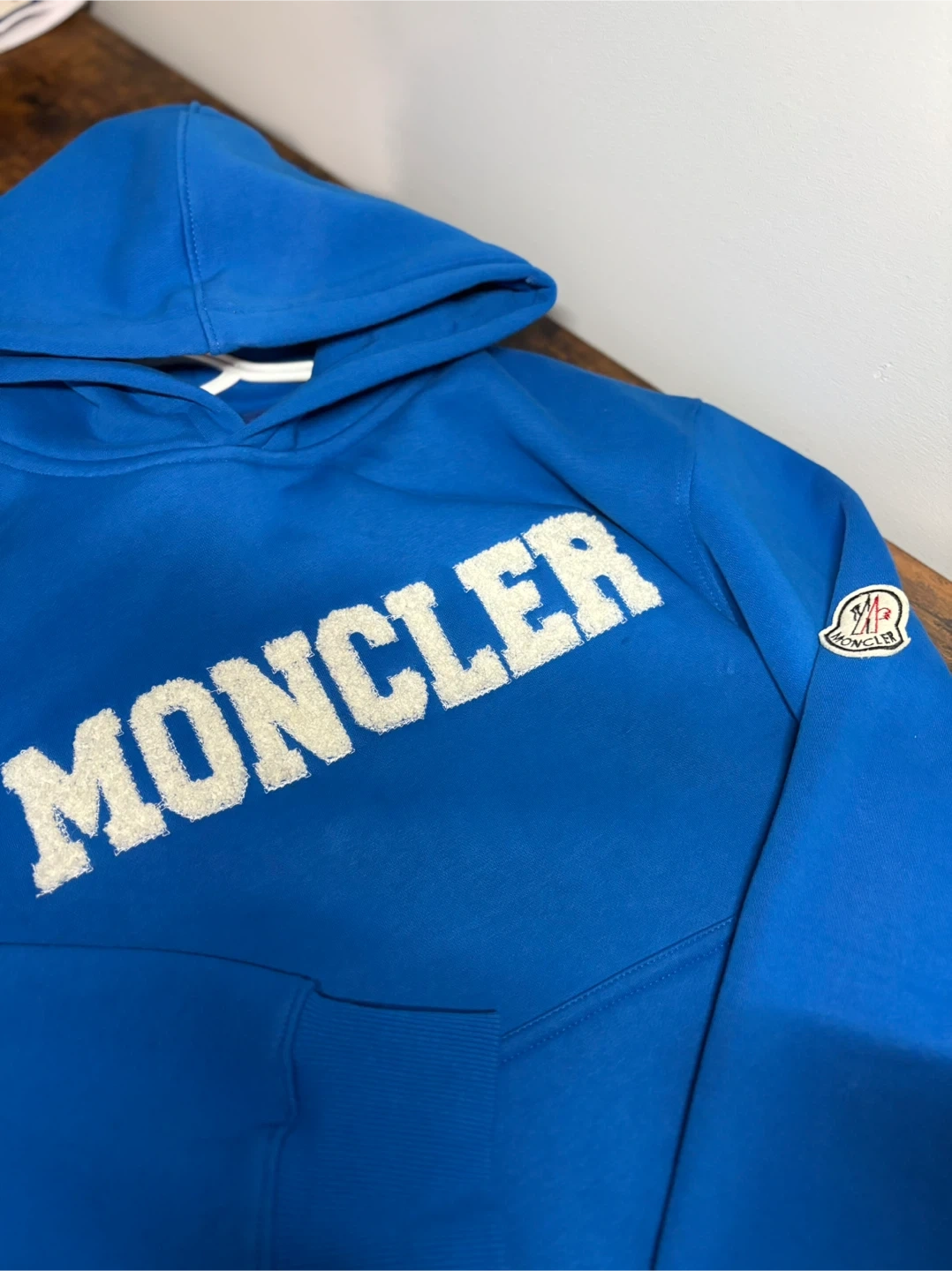 Selling a Moncler hoodie in blue! It features the brand name across the front and the Moncler logo on the sleeve