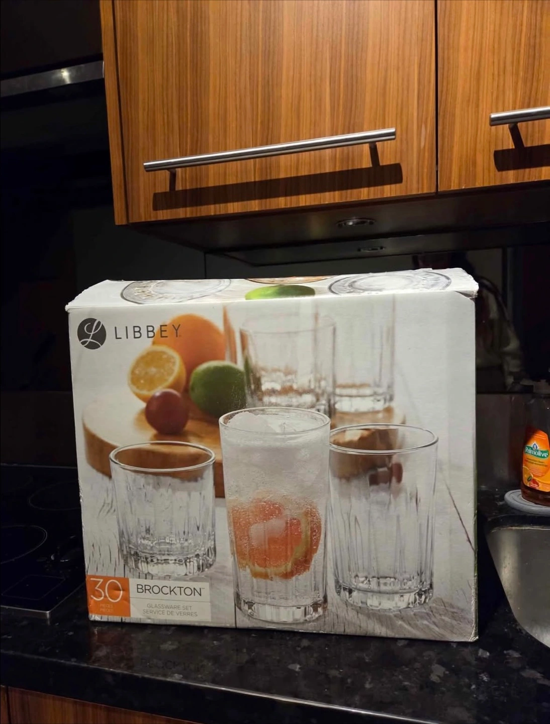 Selling a Libbey Brockton 30-piece glassware set! This set is perfect for everyday use or for entertaining guests. The glasses have a classic design that will complement any table setting. Box is included.