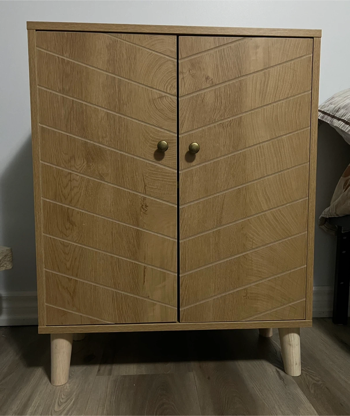 Selling a lovely wooden cabinet! It features a stylish chevron pattern on the doors and has a shelf inside for storage. It's in great condition and would look great in any room of the house